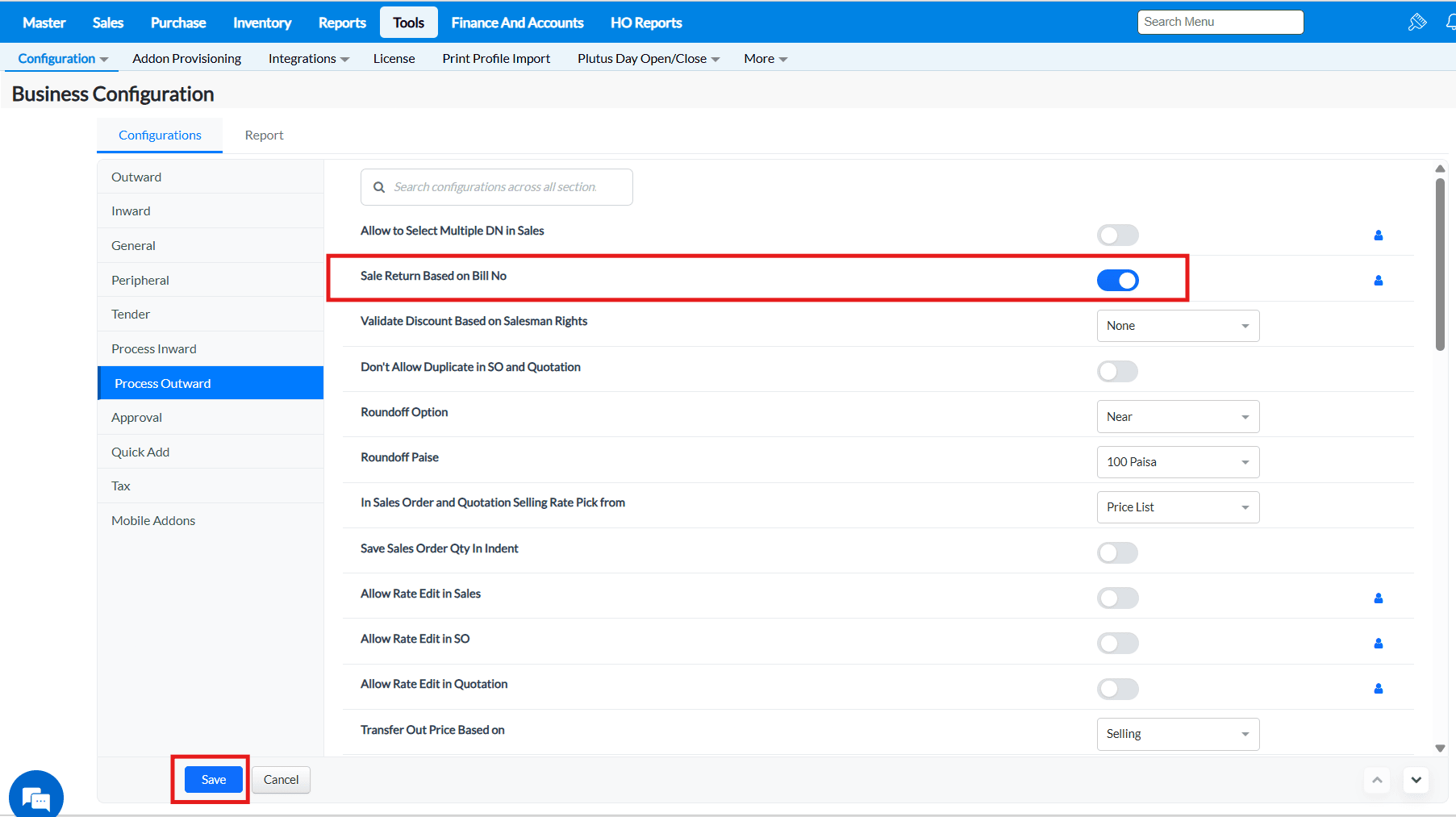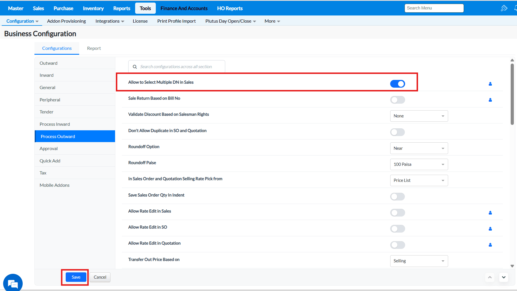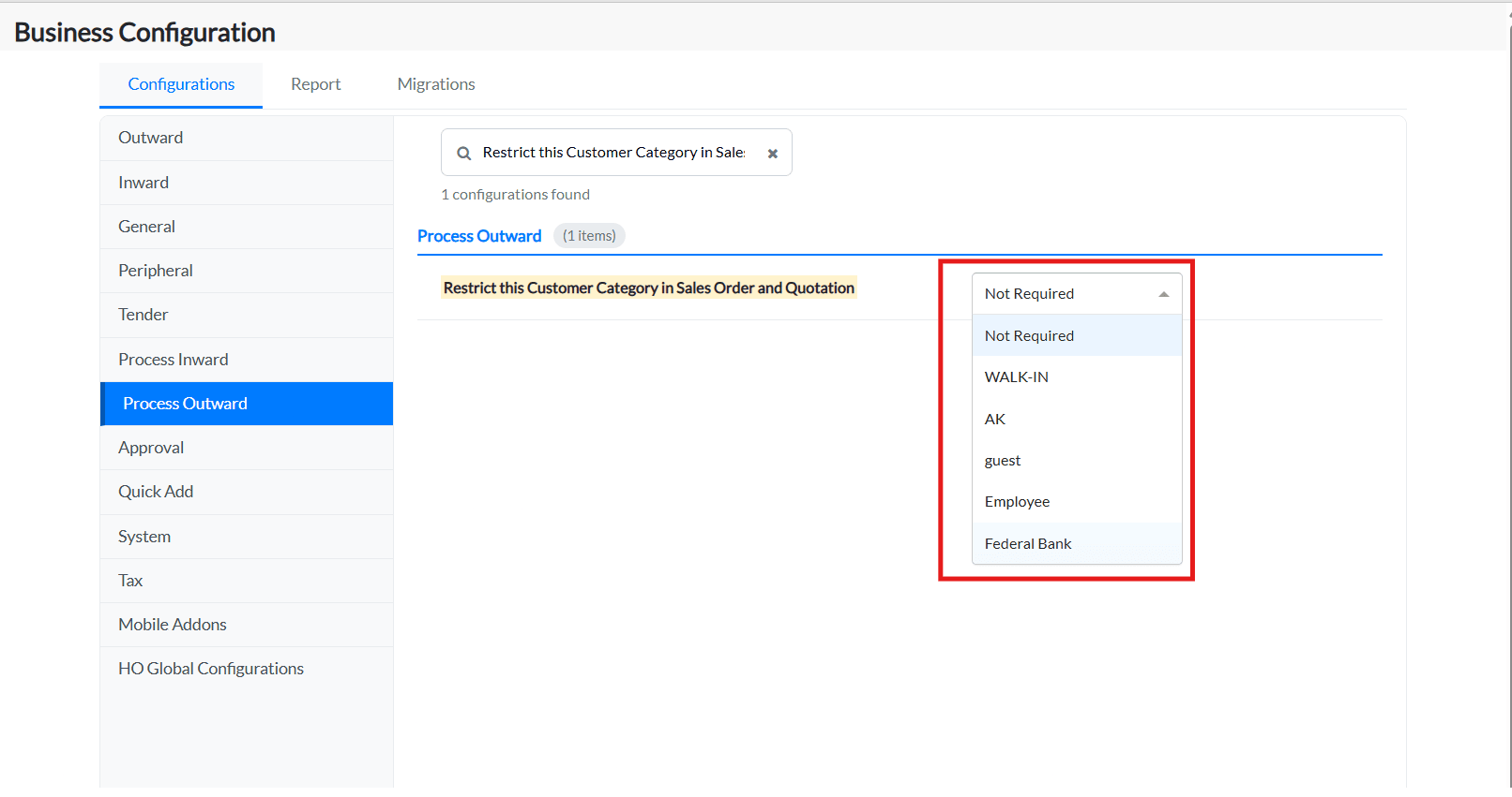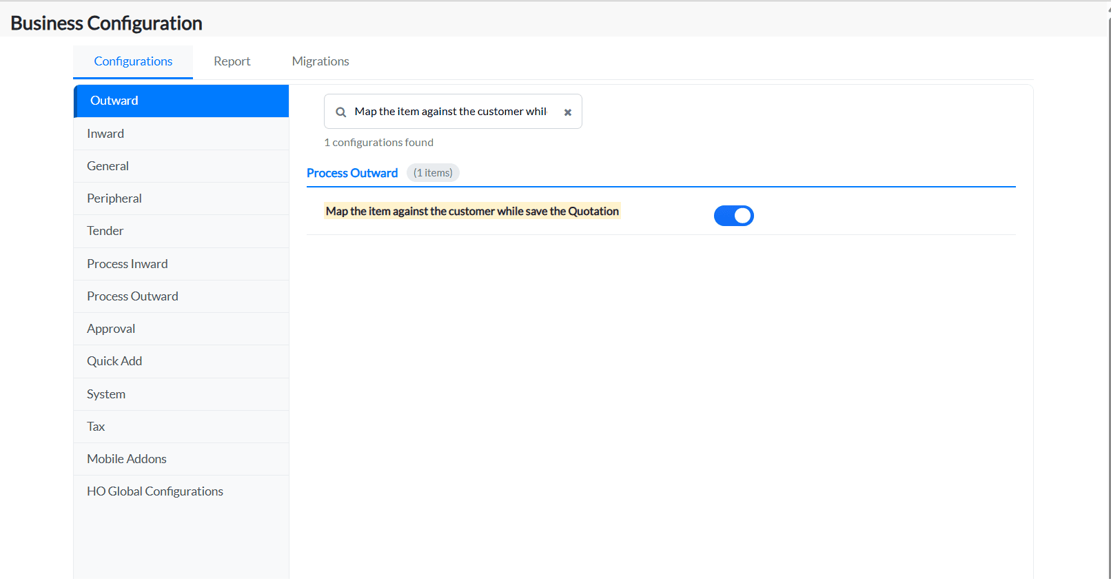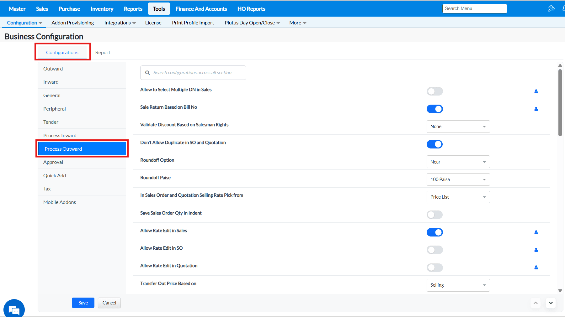 2. Under the Configurations tab, click on the Process Outward tab and all the configurations under this tab will be listed.