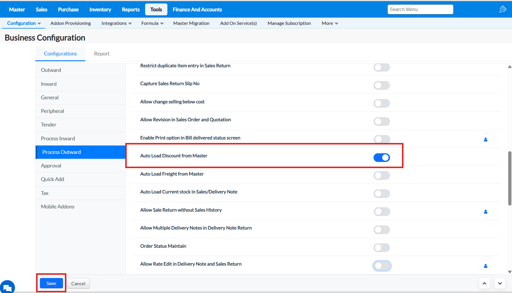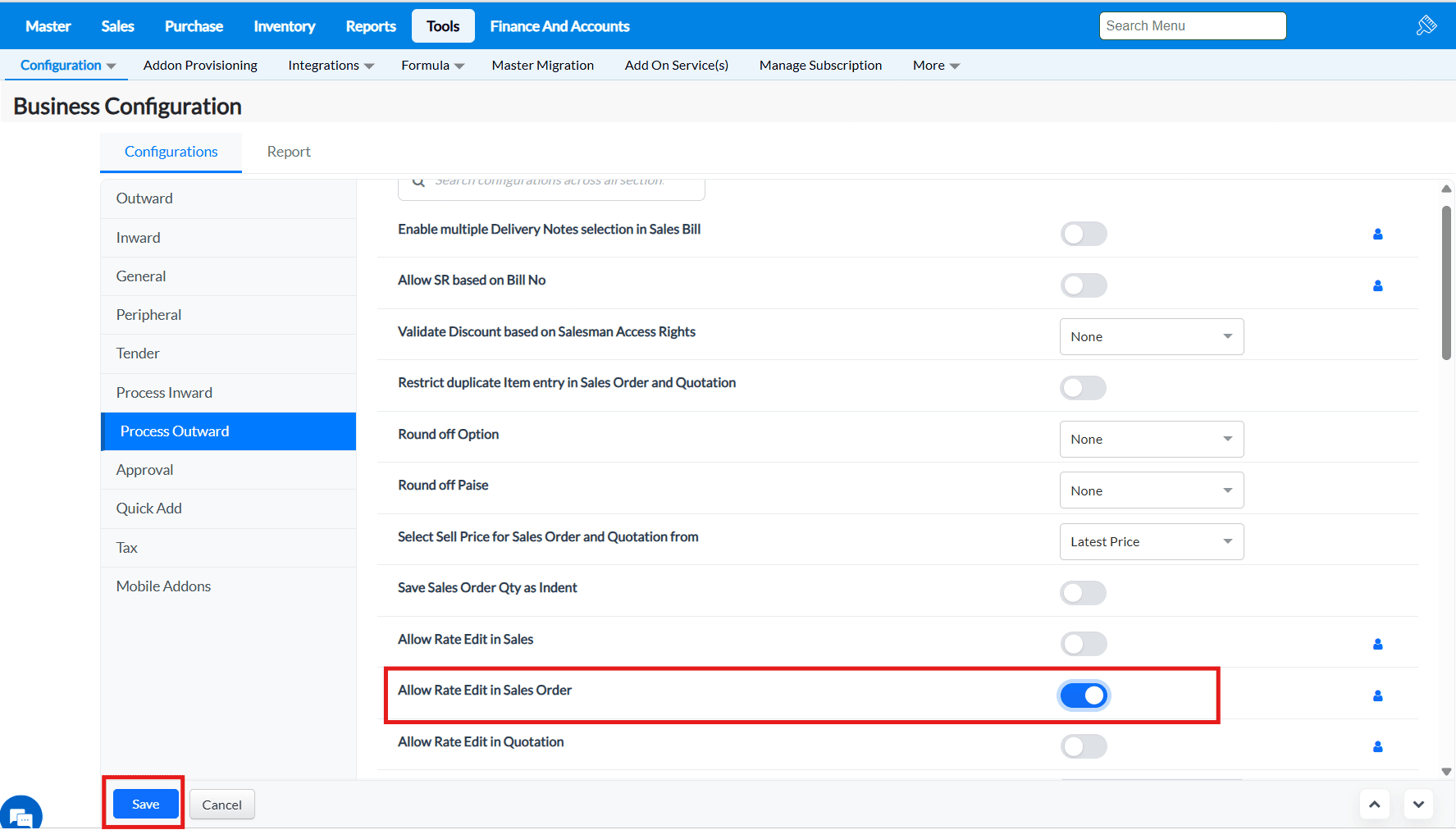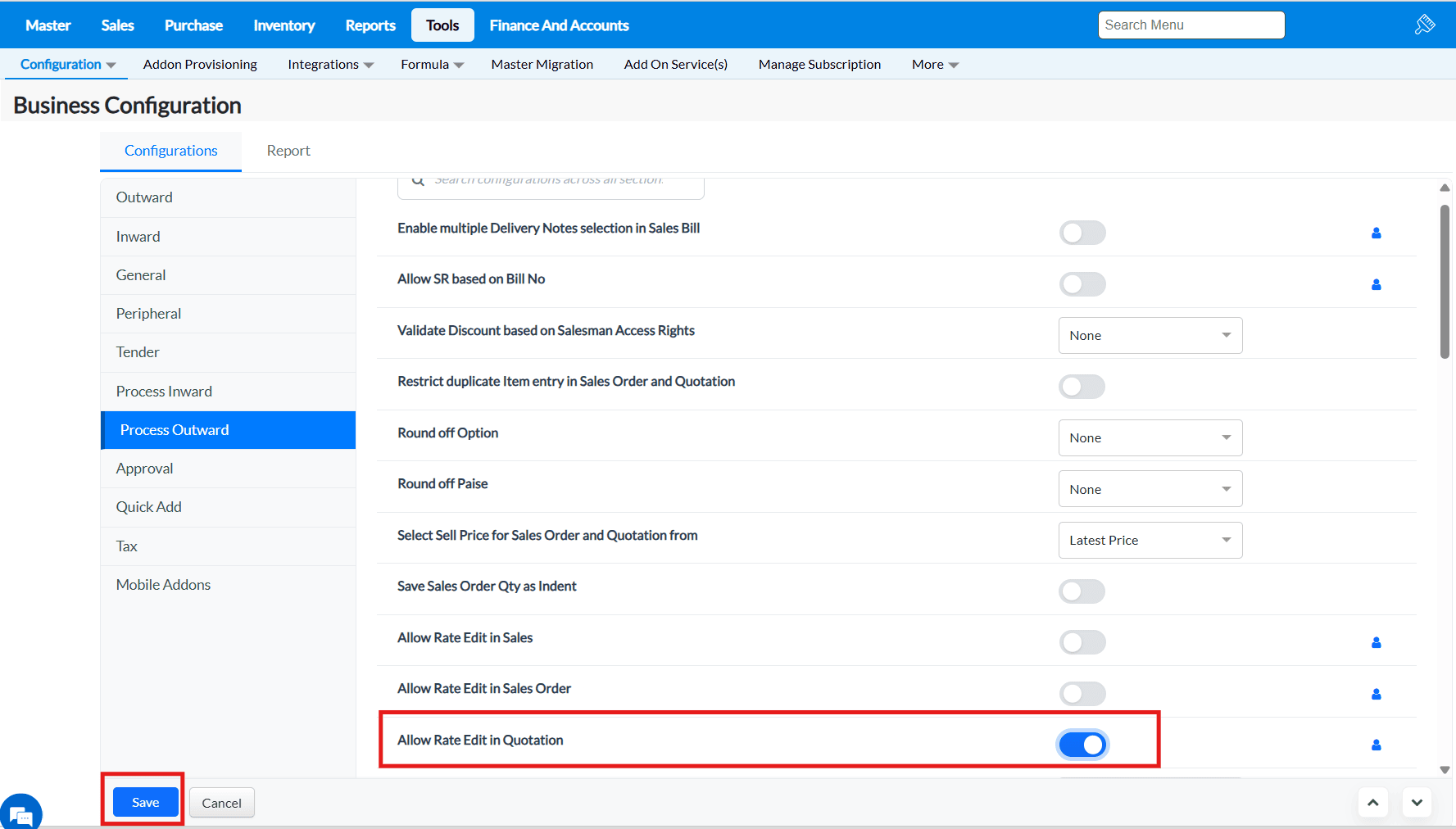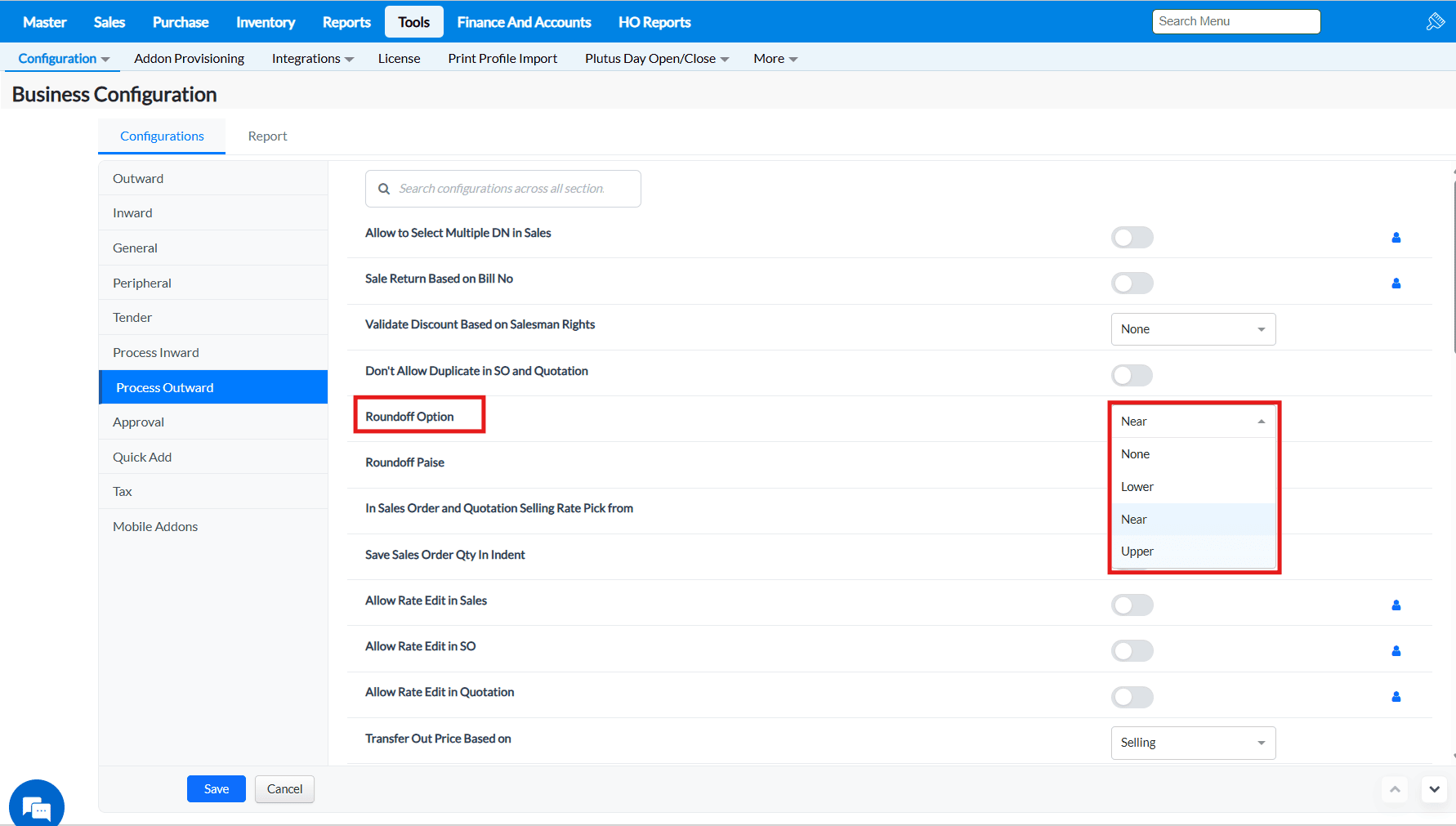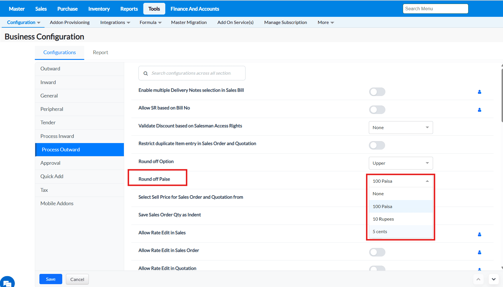 2. Under the Configurations tab, click on the Process Outward tab and all the configurations under this tab will be listed.