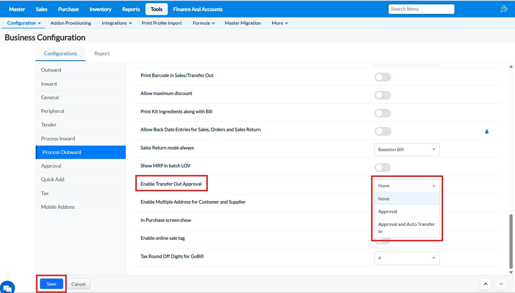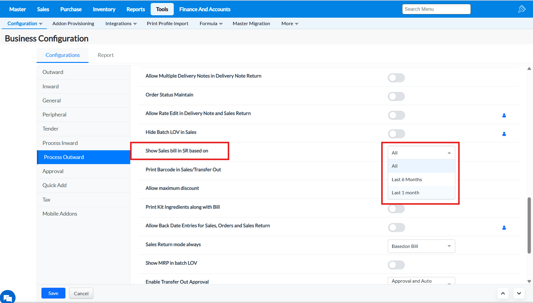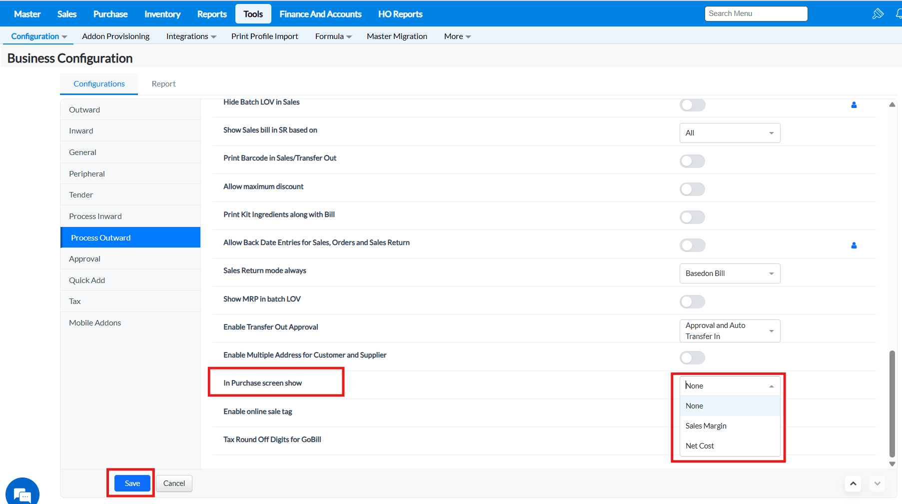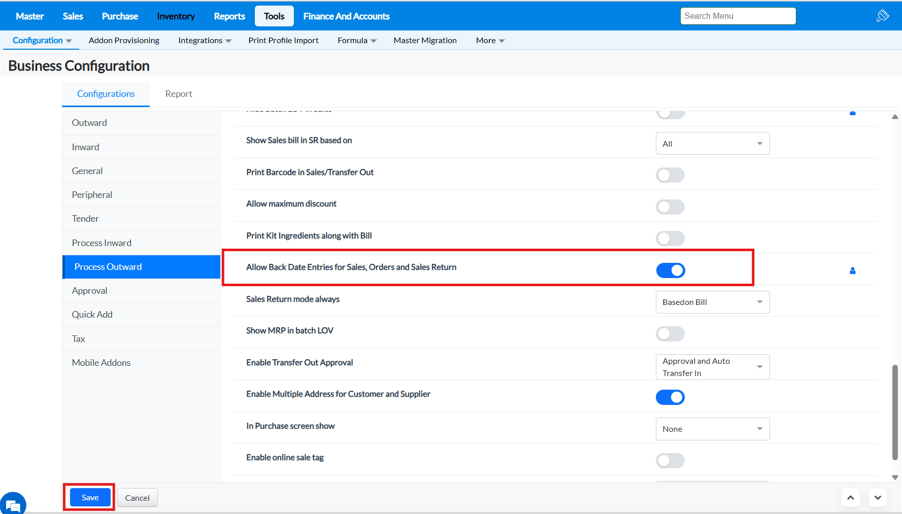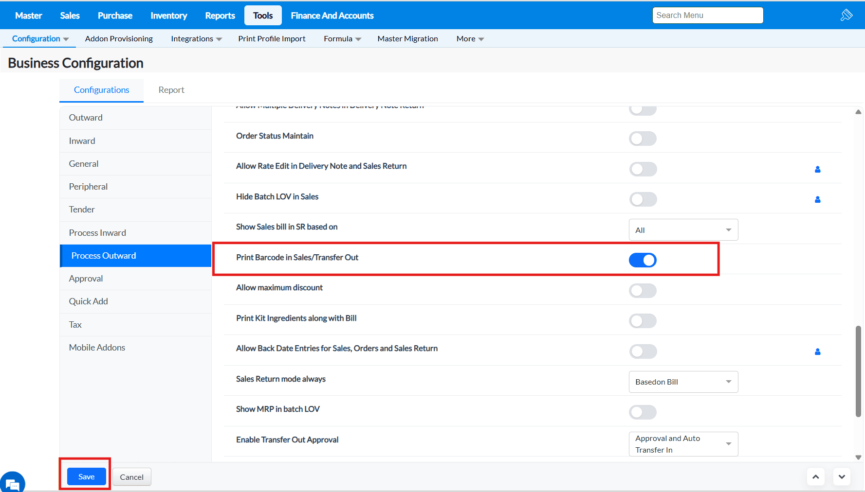 Purpose : The configurations present in the Outward tab allows to enable or disable functionalities that are common to most of the screens of TruePOS and not specific to any particular module.