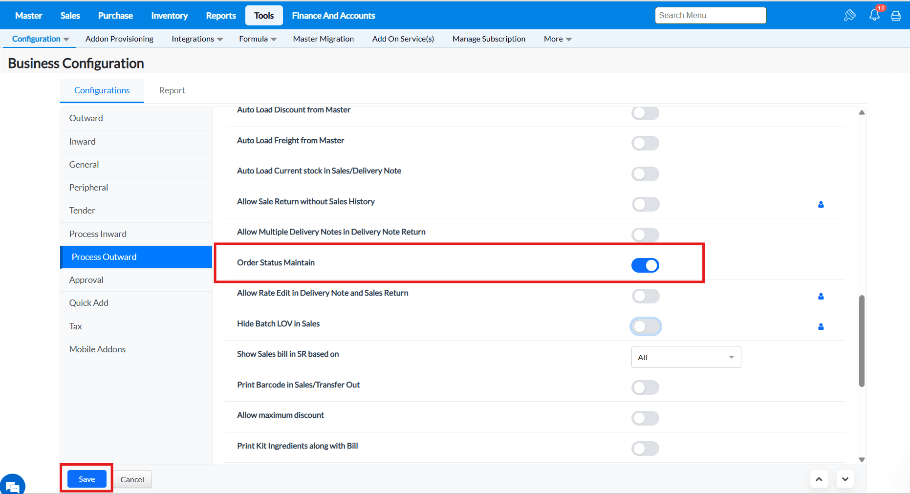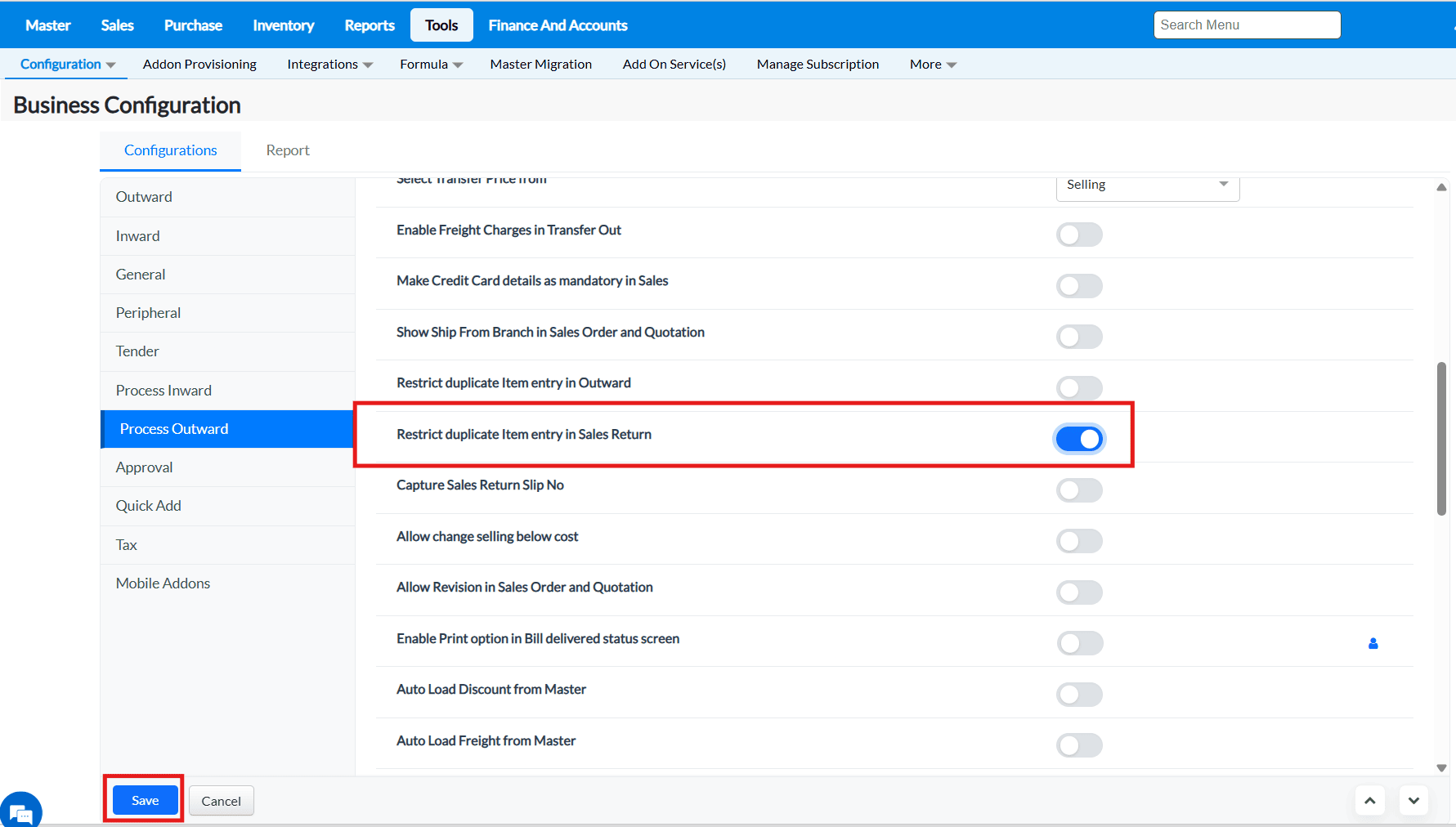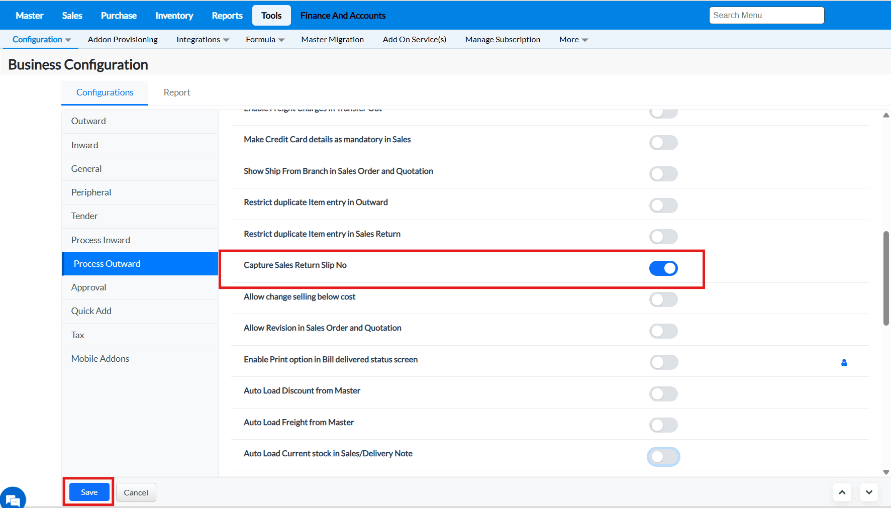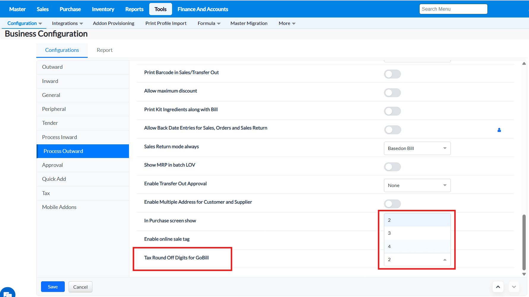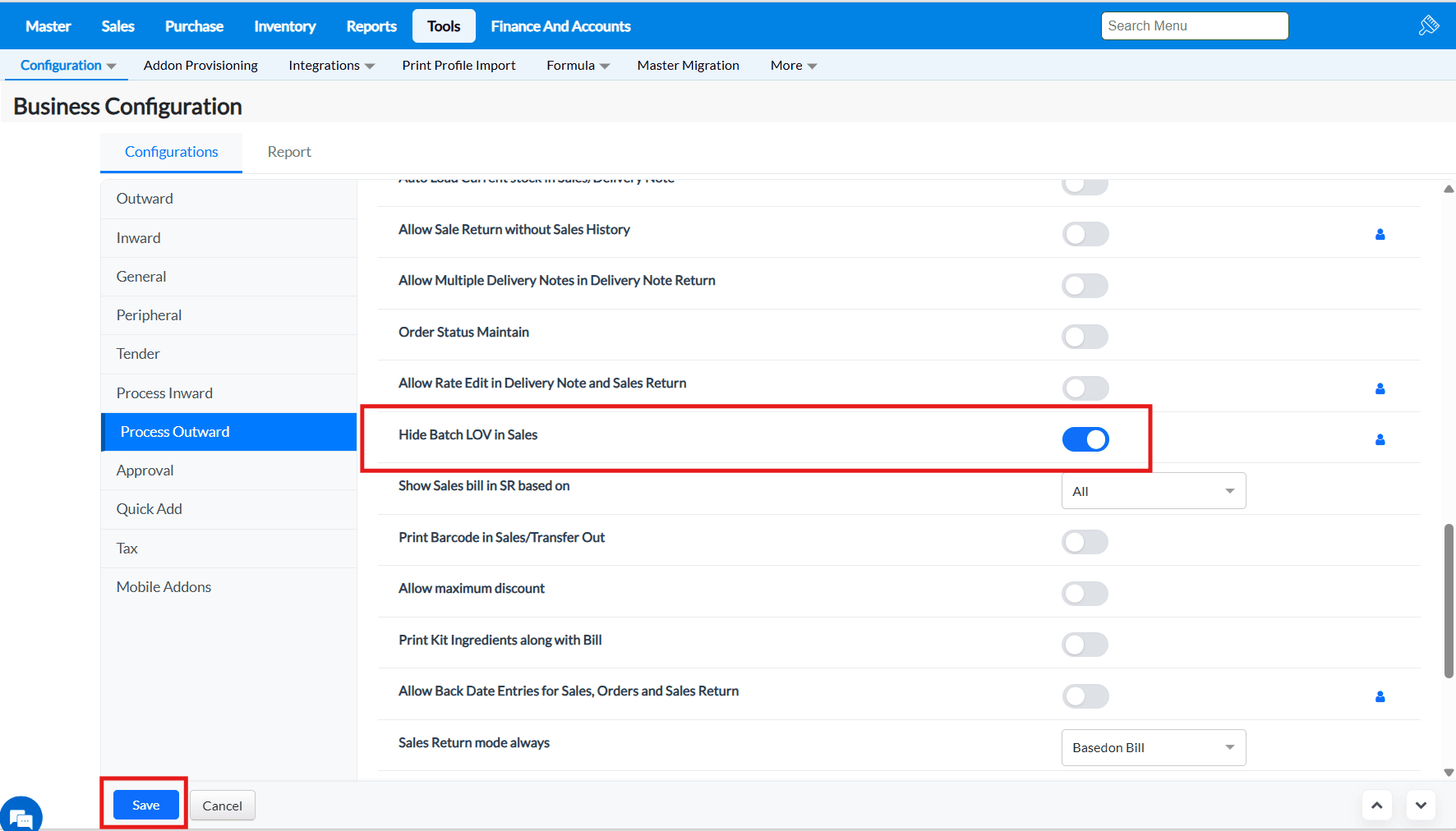 Purpose : The configurations present in the Outward tab allows to enable or disable functionalities that are common to most of the screens of TruePOS and not specific to any particular module.