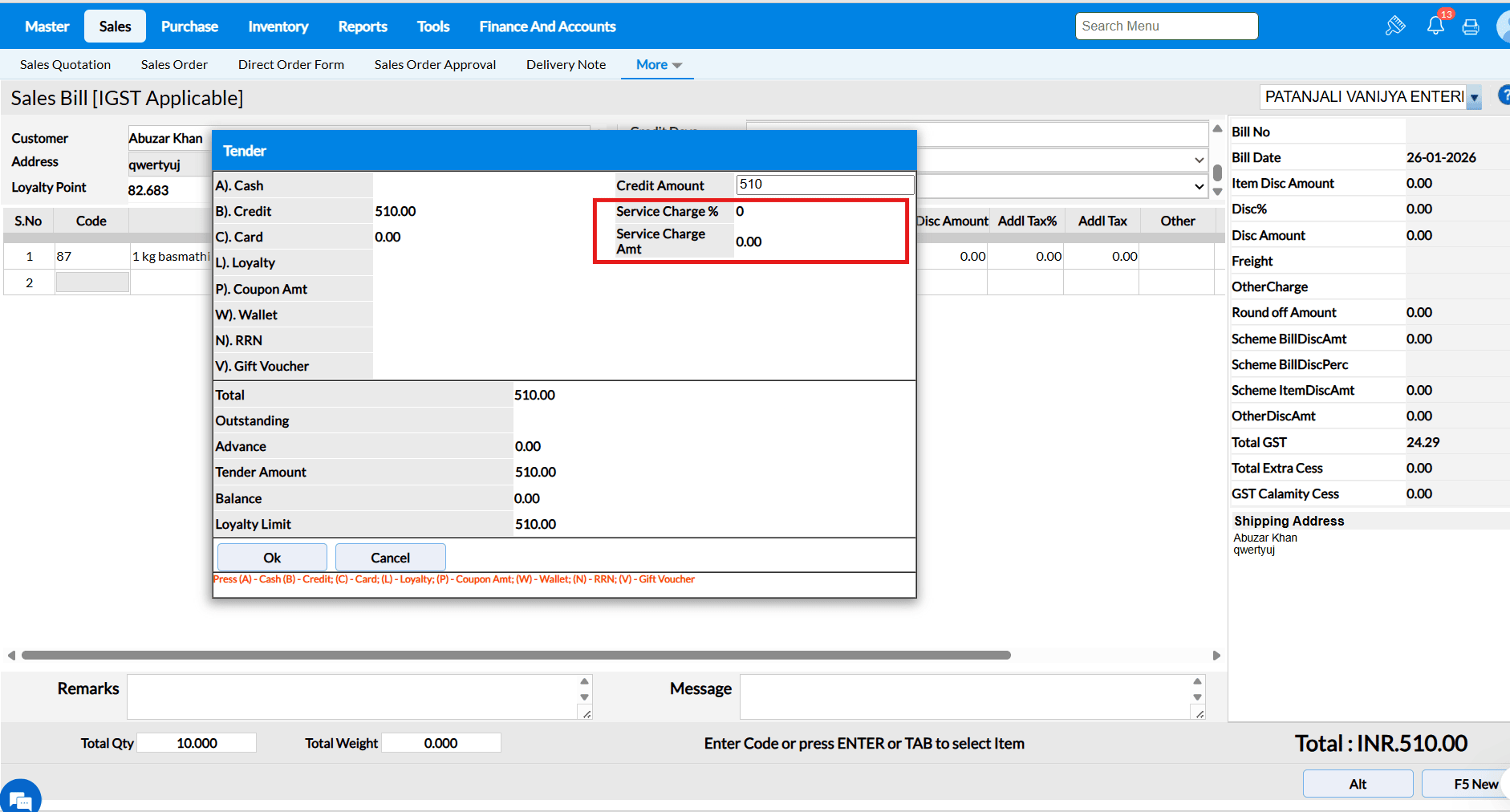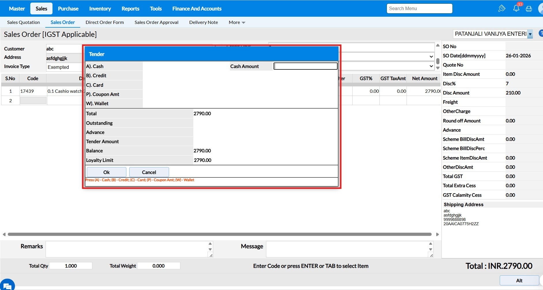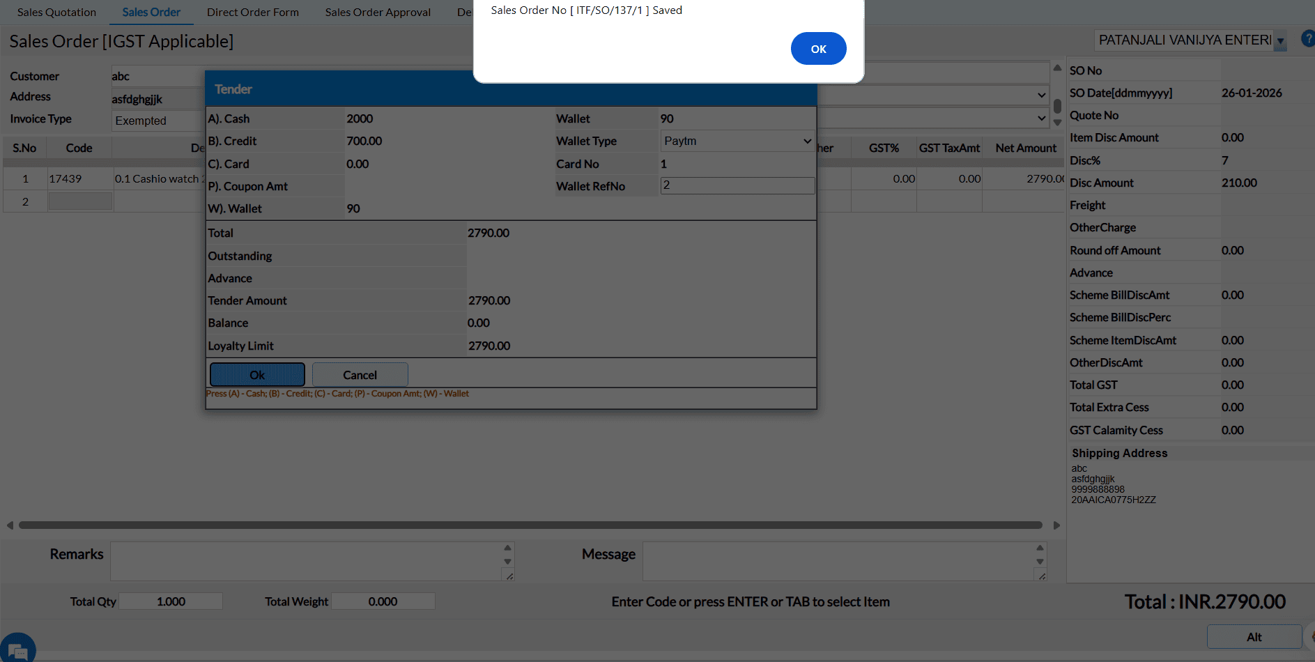 Tender screen will appear while saving the Sales Order