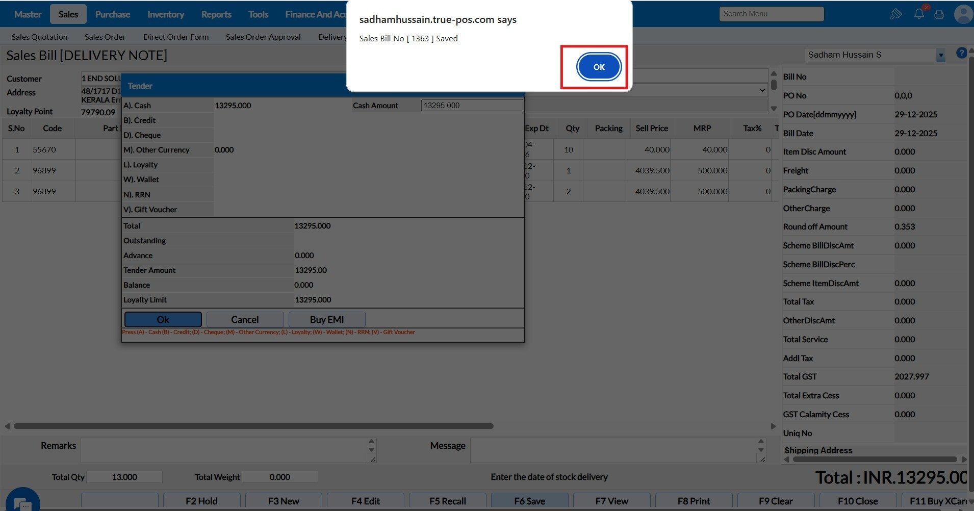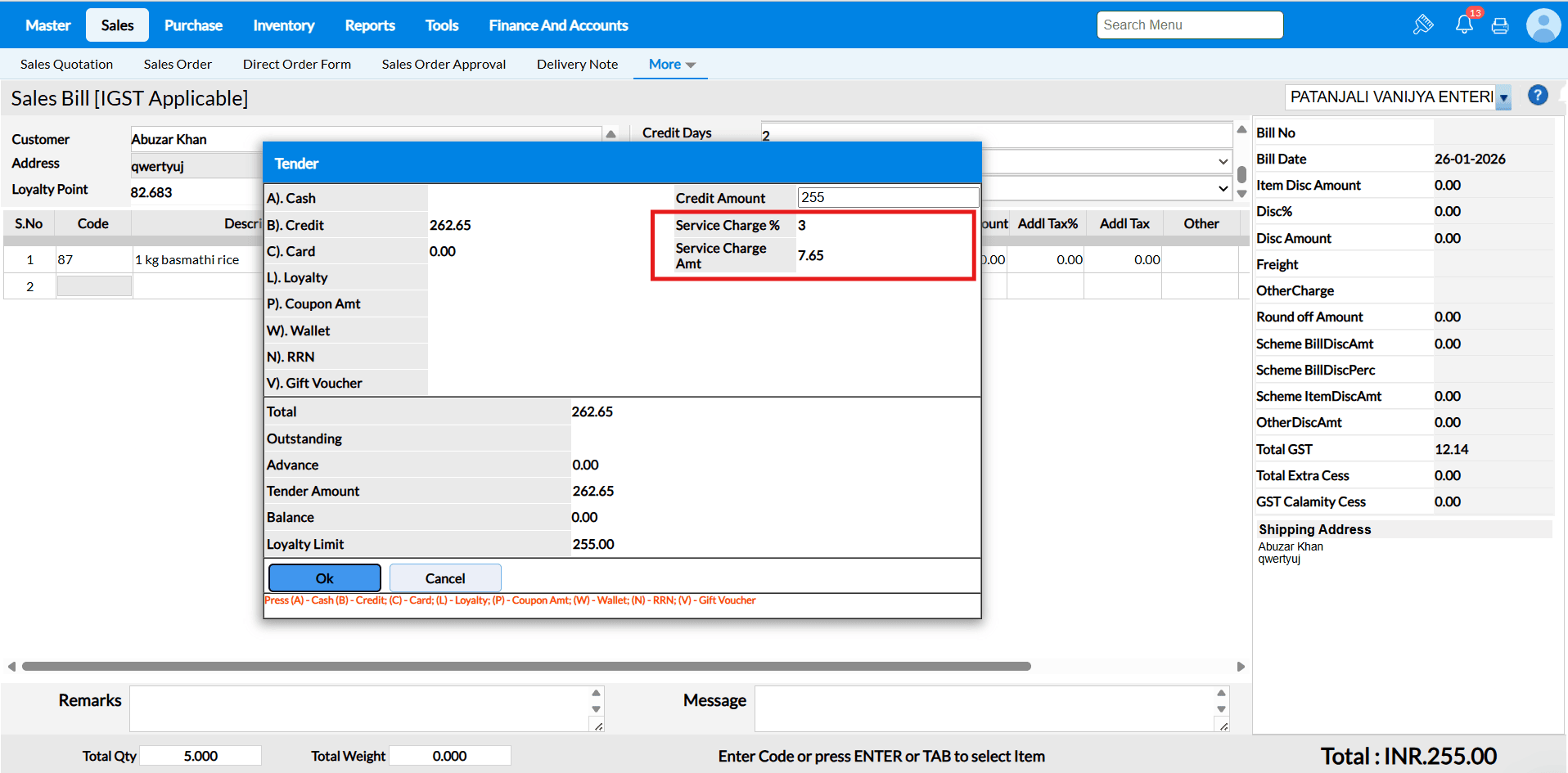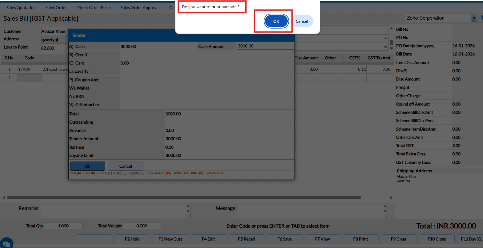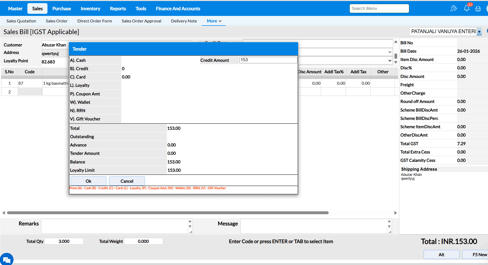 Tender screen will appear while saving the Sales Order