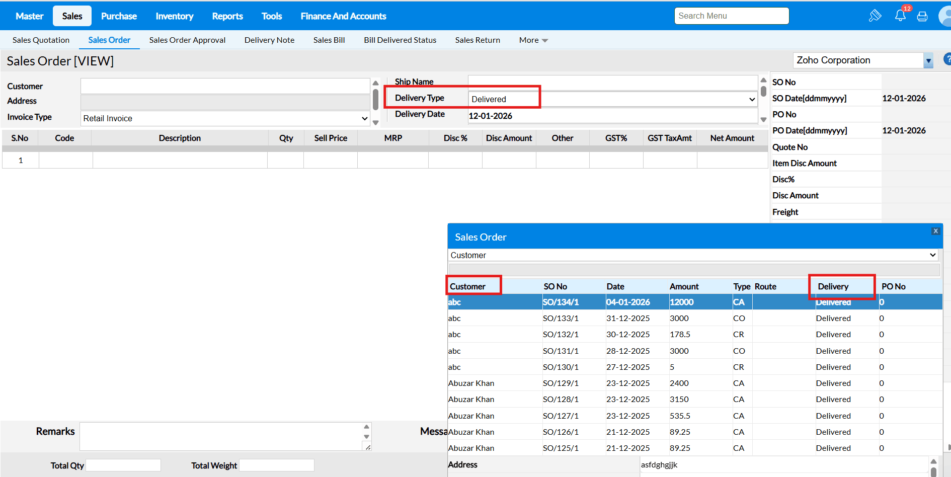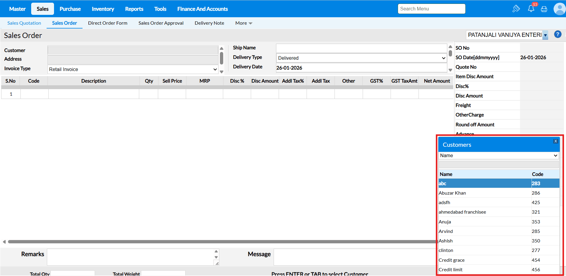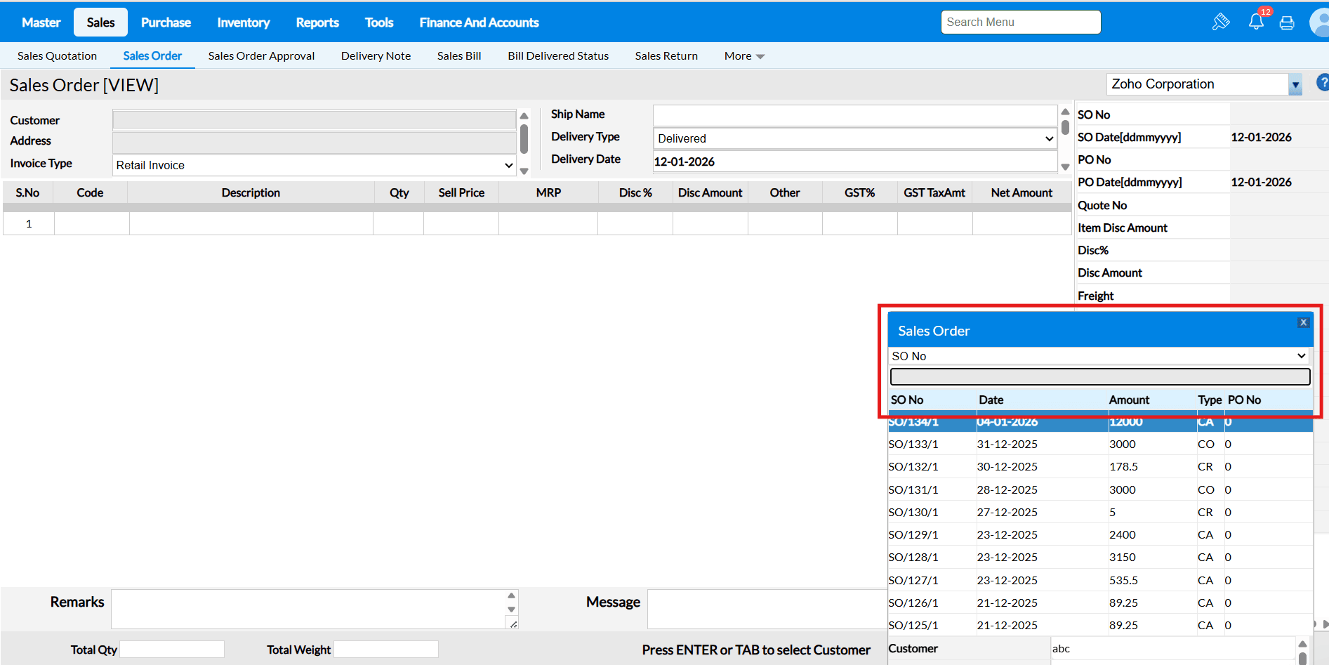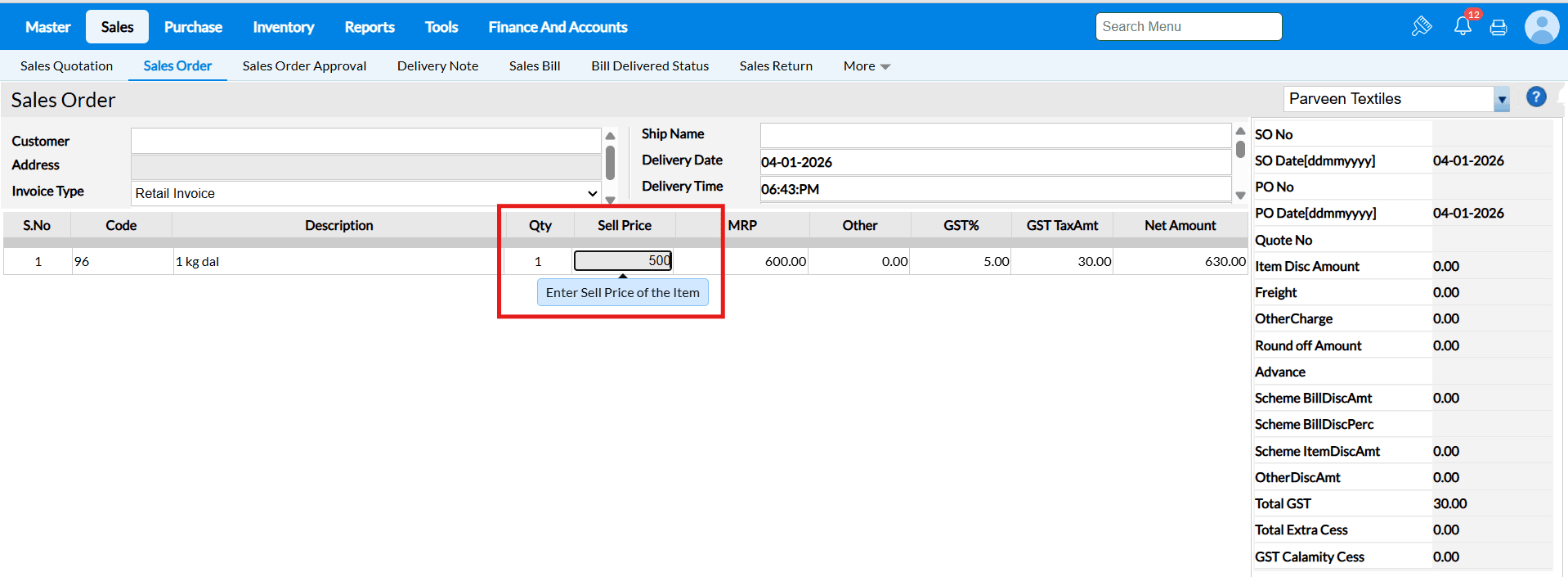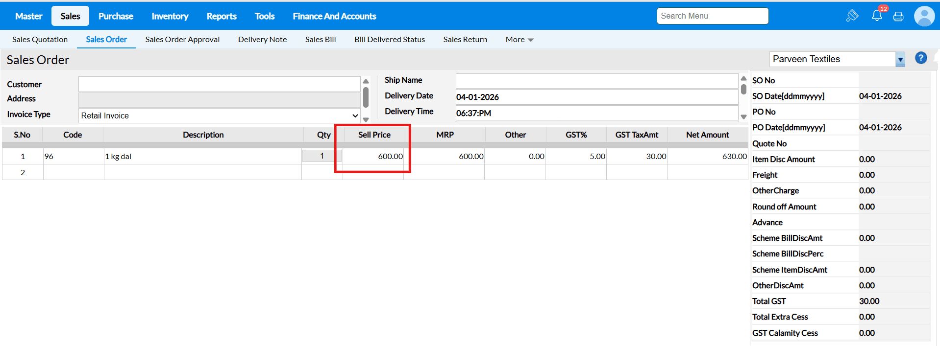 Sales Order screen