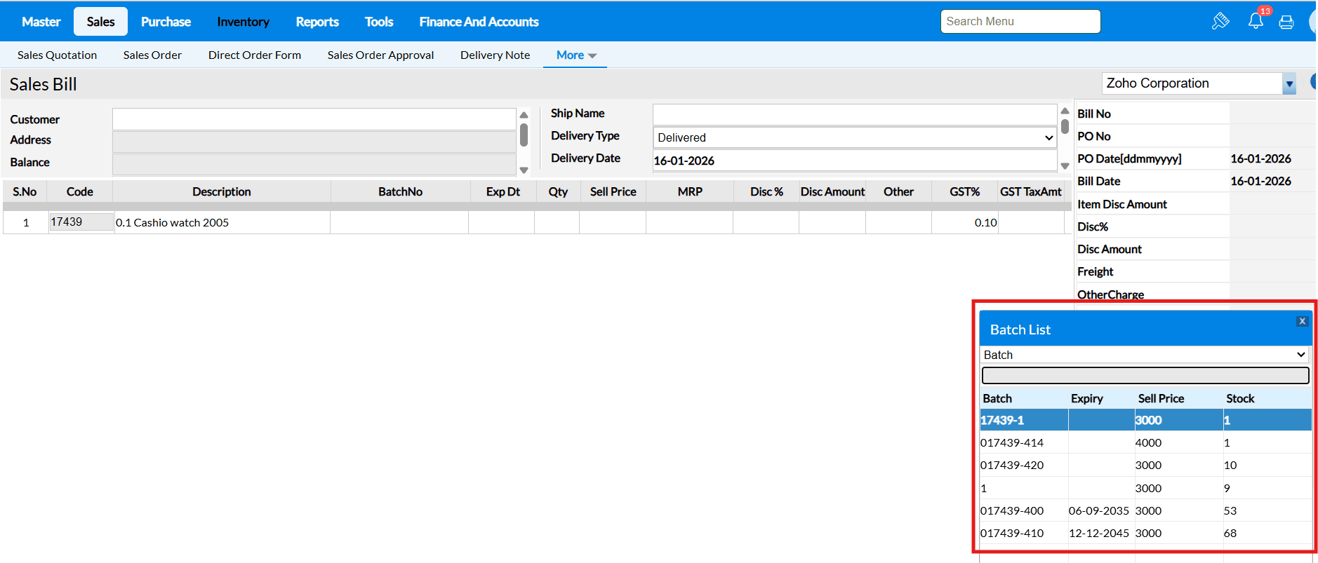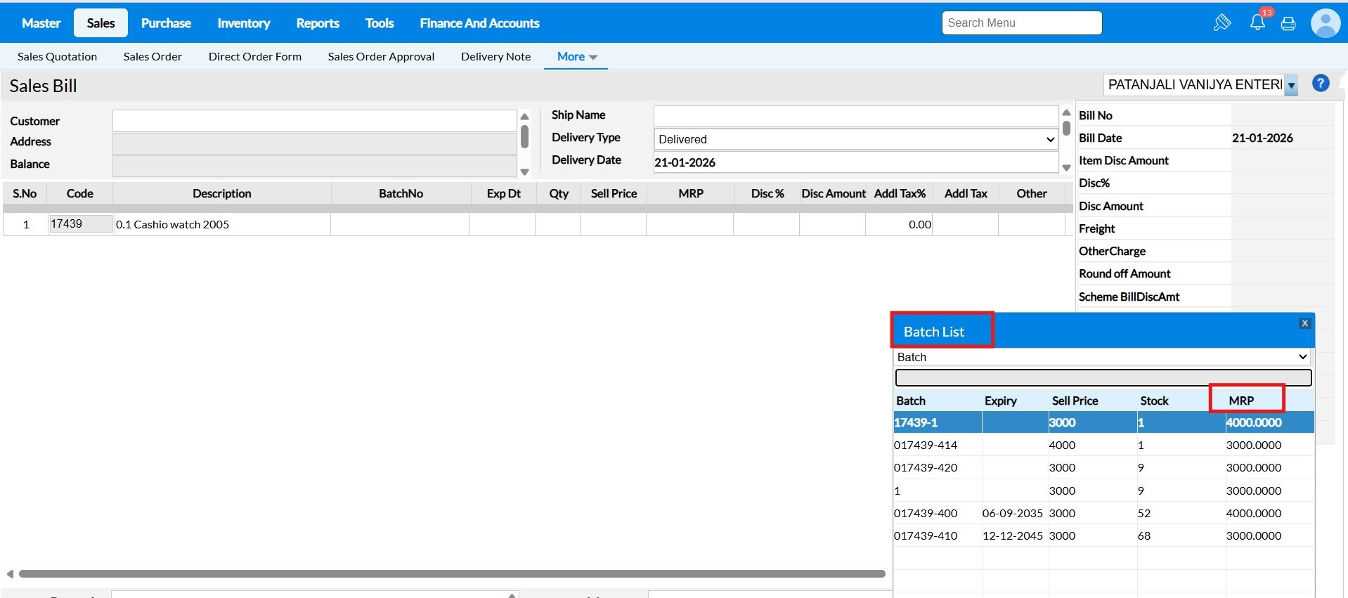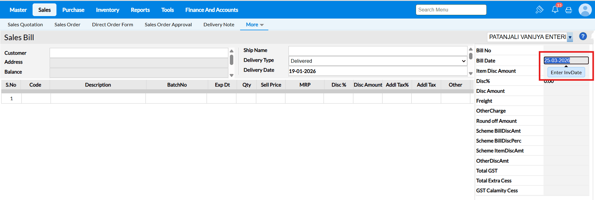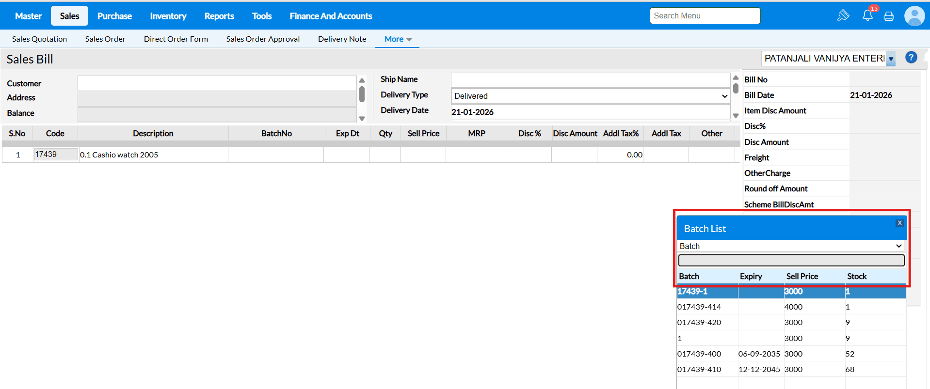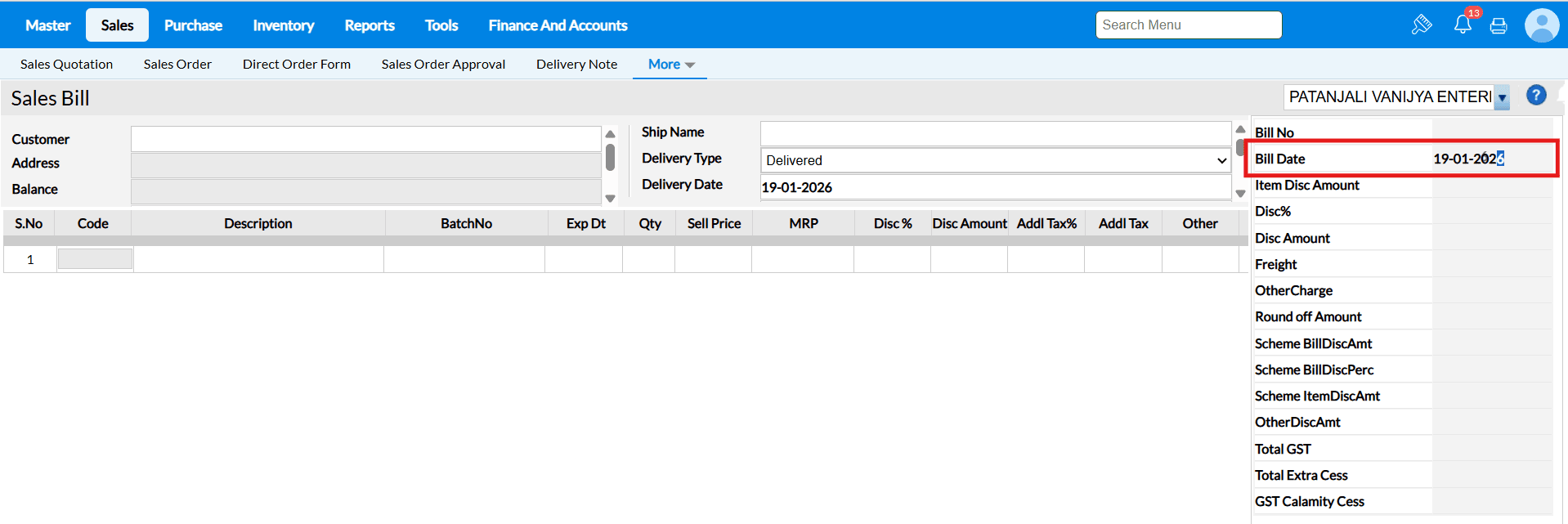 Answer : All items from the selected DNs are automatically fetched into the sales bill with their respective quantities, rates, and taxes. The system consolidates them accurately in one invoice.