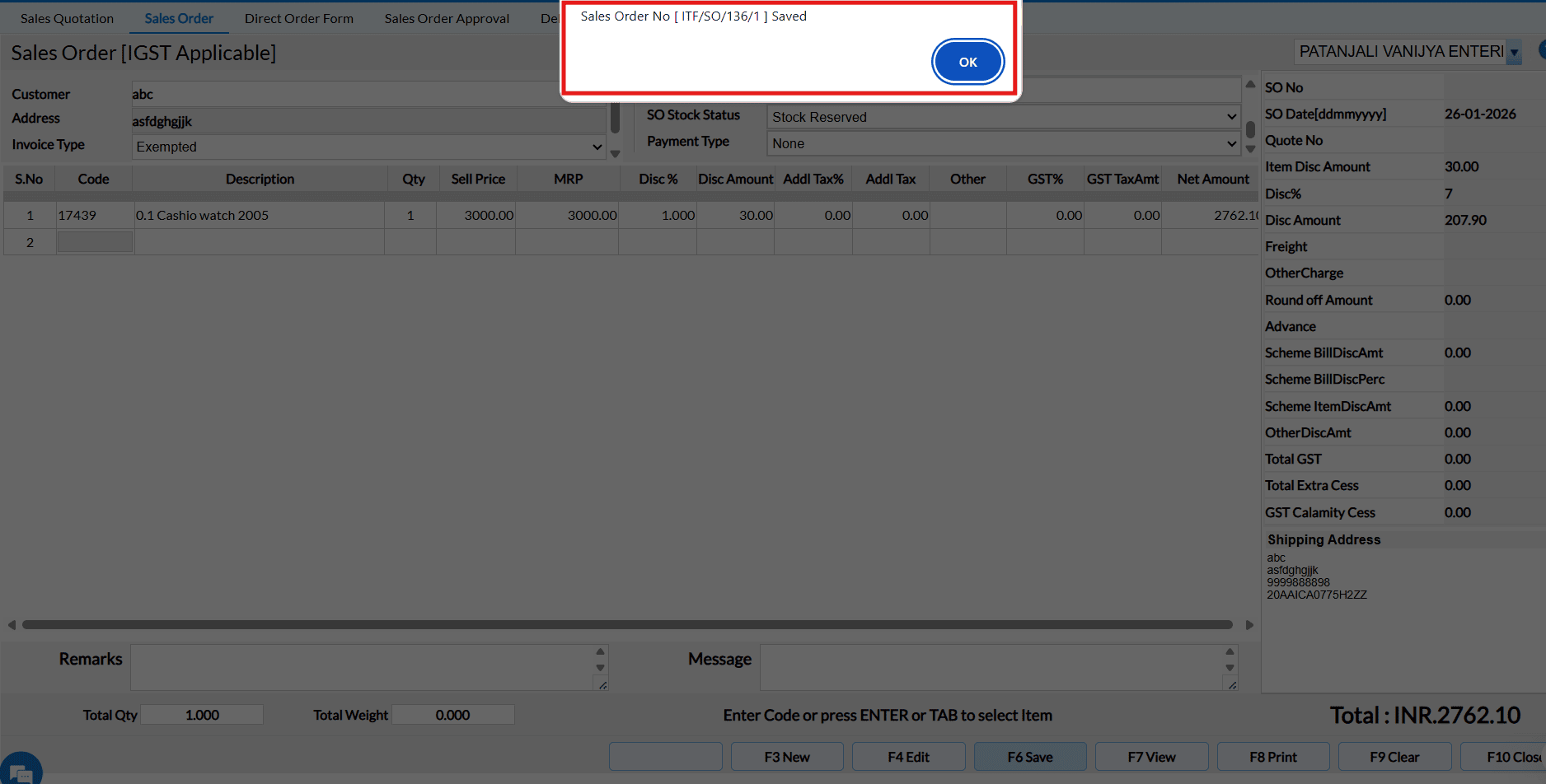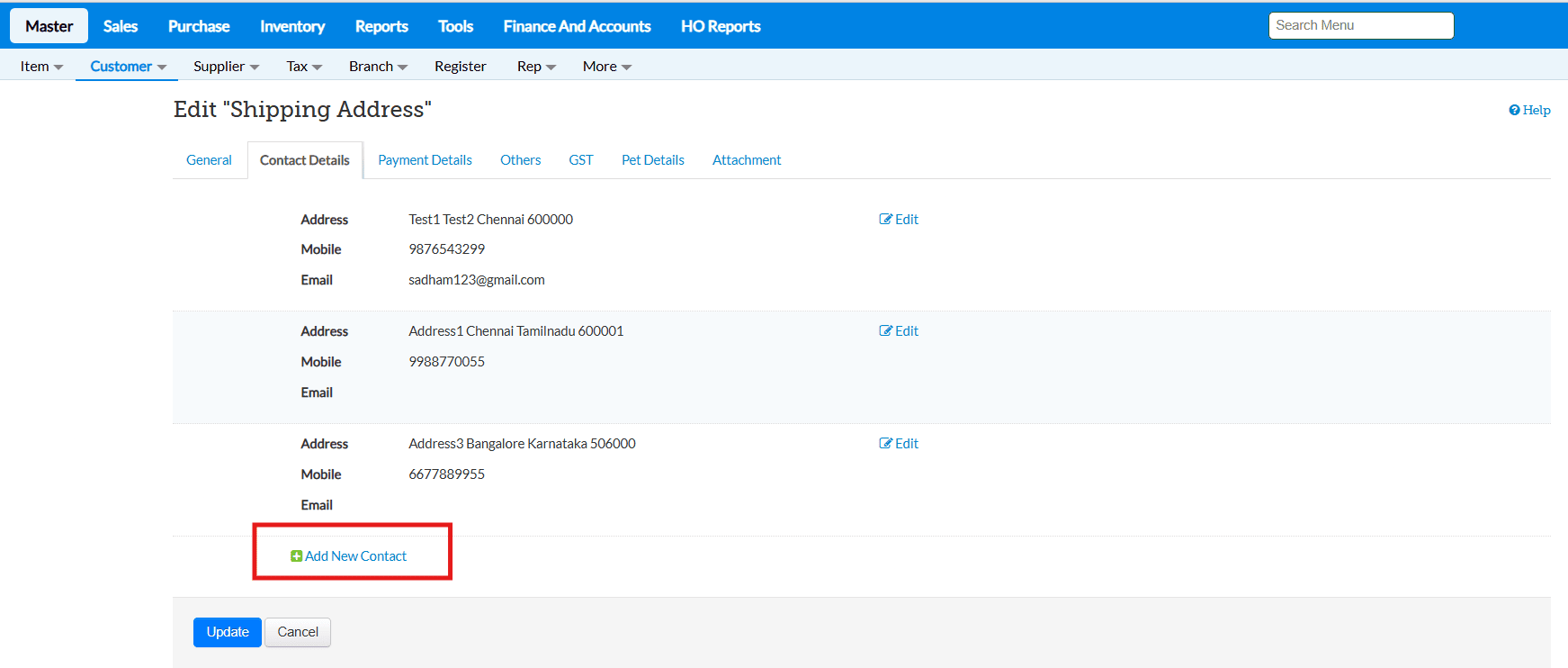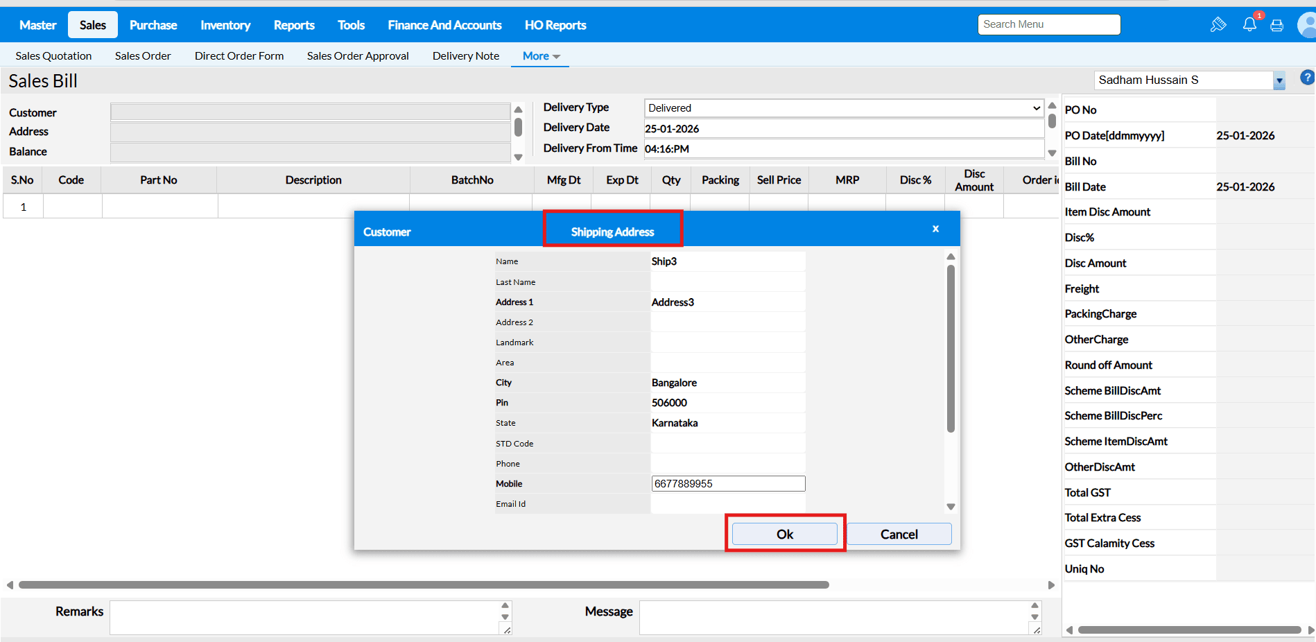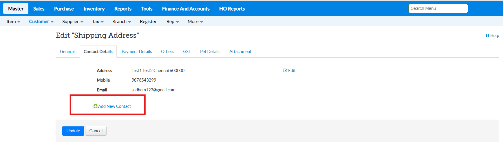 After saving the transaction, the entered shipping address will automatically be saved and mapped to the respective customer in Customer Master for future use.