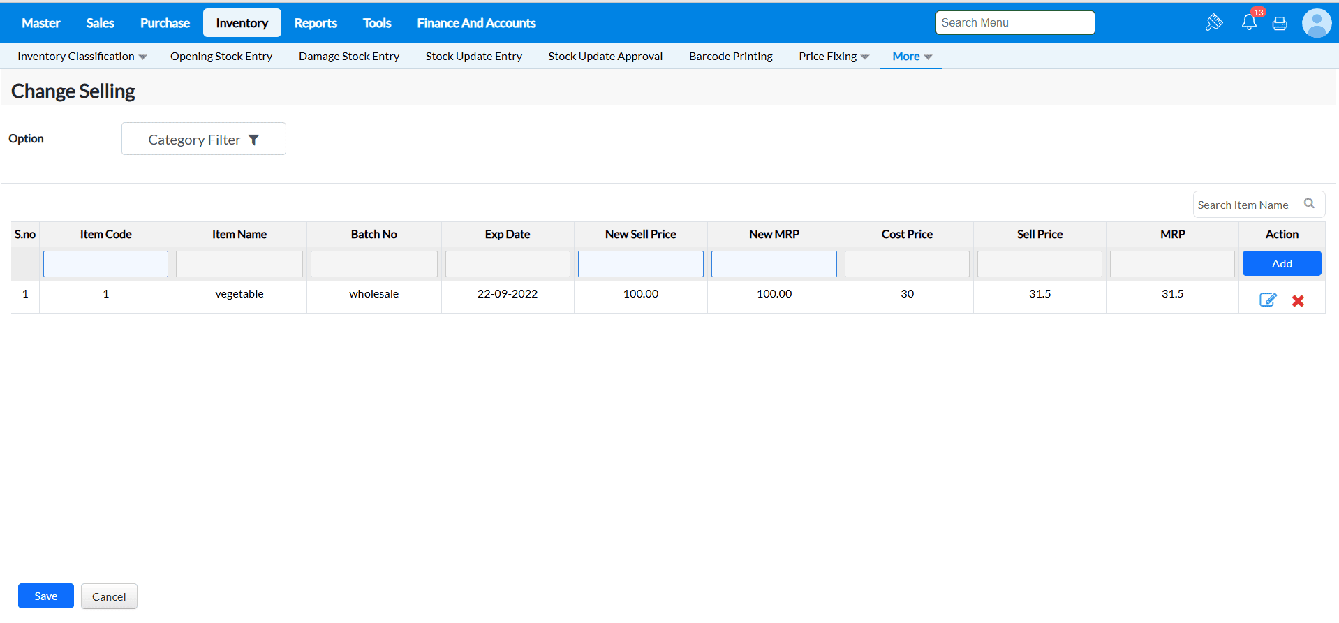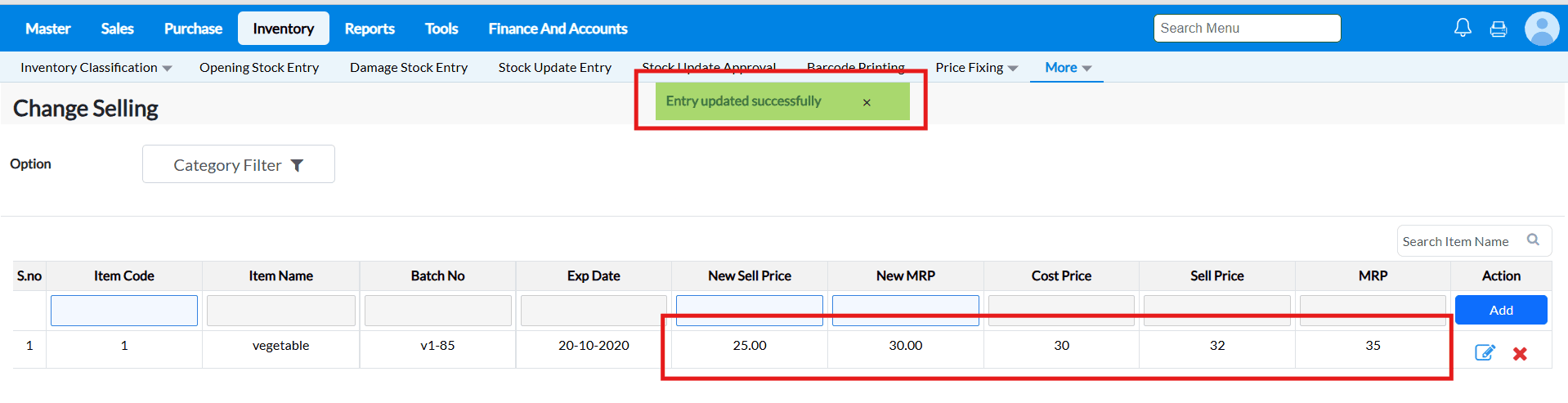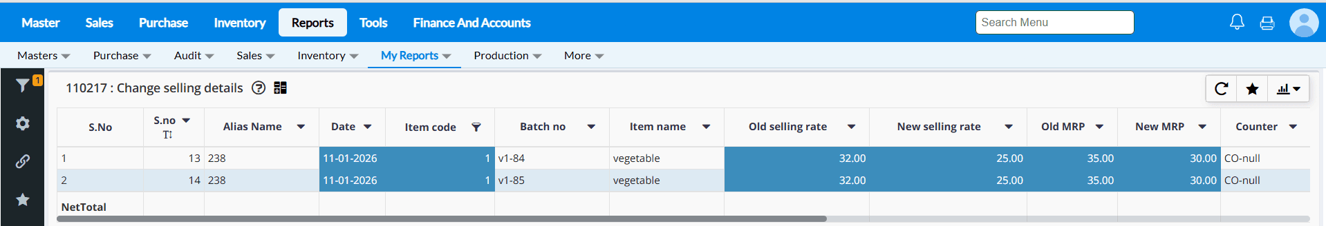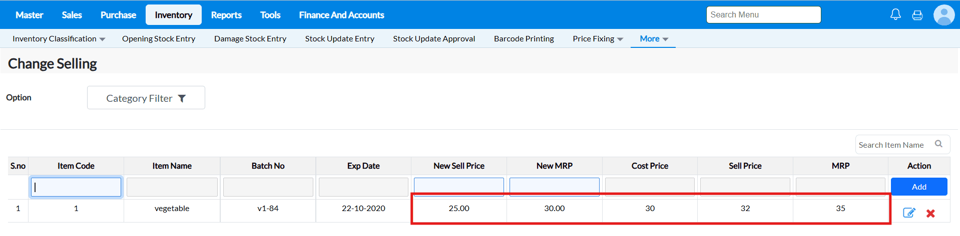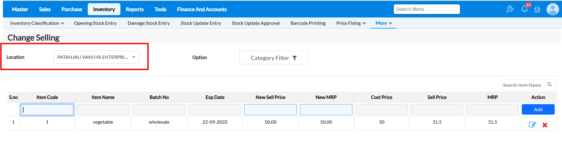 Example : The costs of the goods in supermarkets and grocery stores are constantly fluctuating. You may load the items and alter the selling price and MRP in a matter of seconds using the Change Selling interface.
