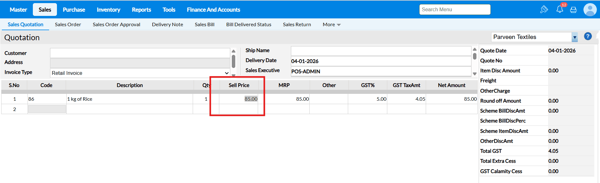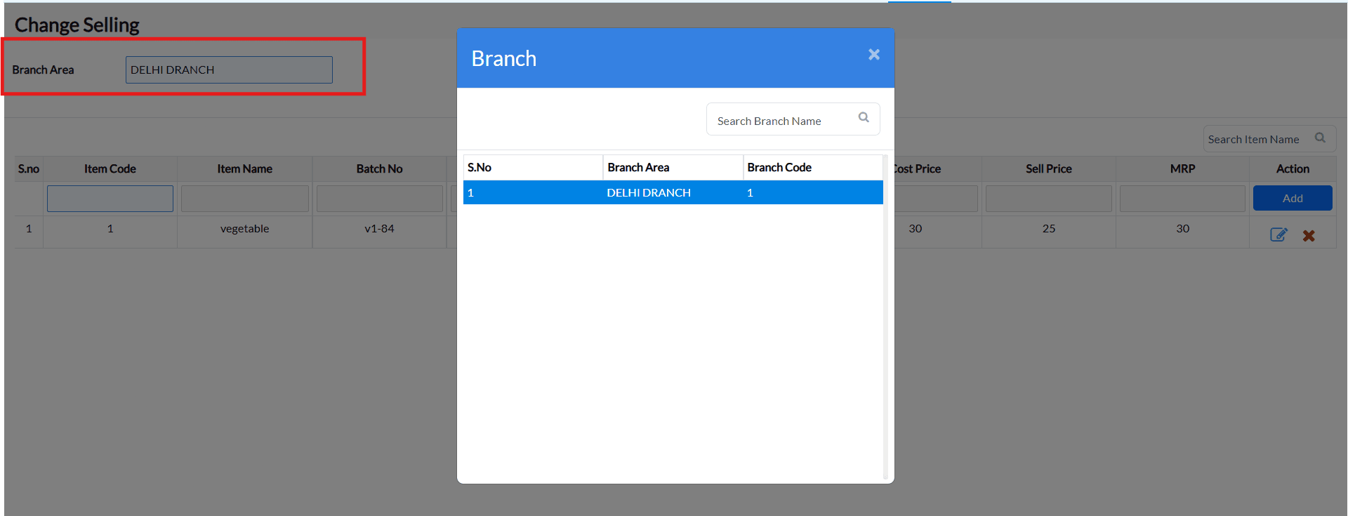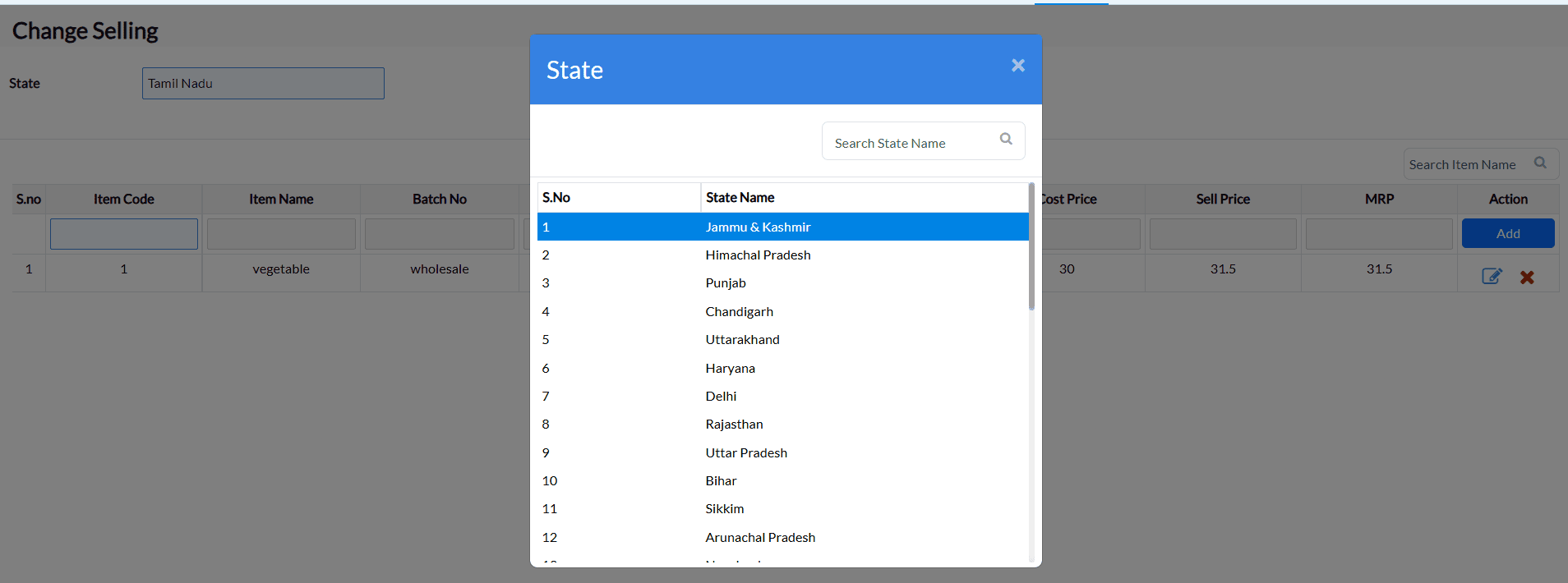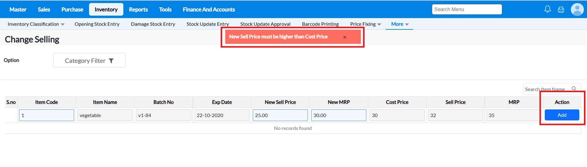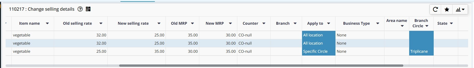 Example : The costs of the goods in supermarkets and grocery stores are constantly fluctuating. You may load the items and alter the selling price and MRP in a matter of seconds using the Change Selling interface.