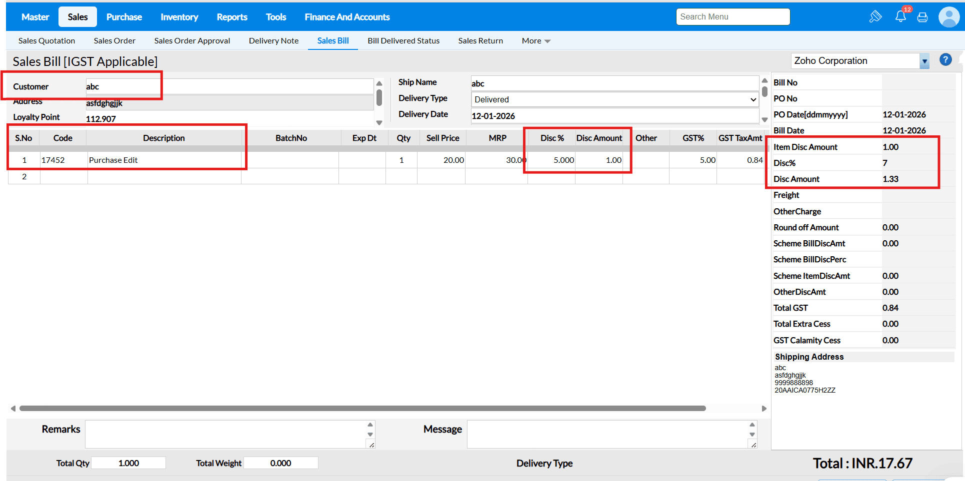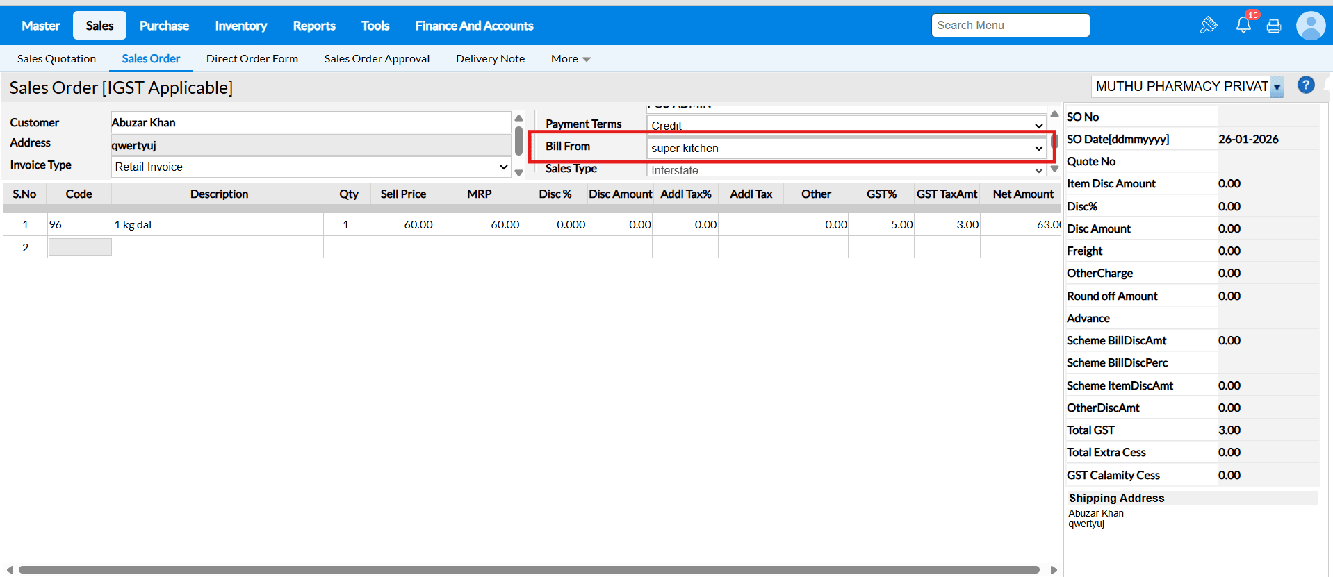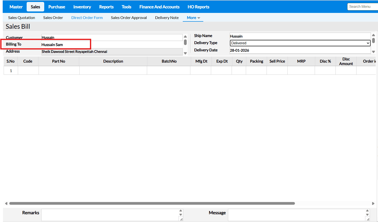 In the Billing To field, you can select the required Billing To Address, which will be considered as the Billing Address for the transaction.