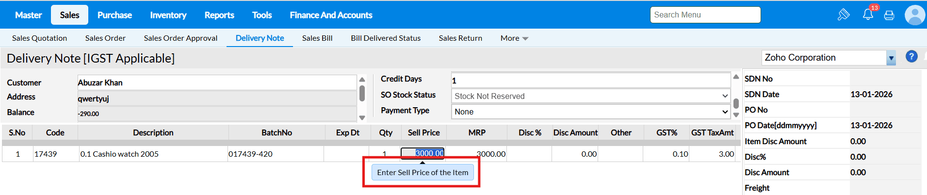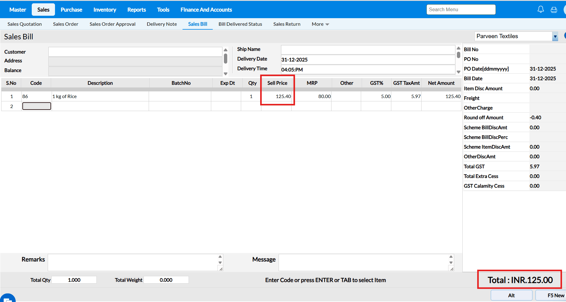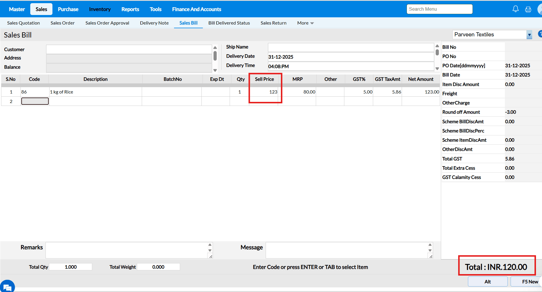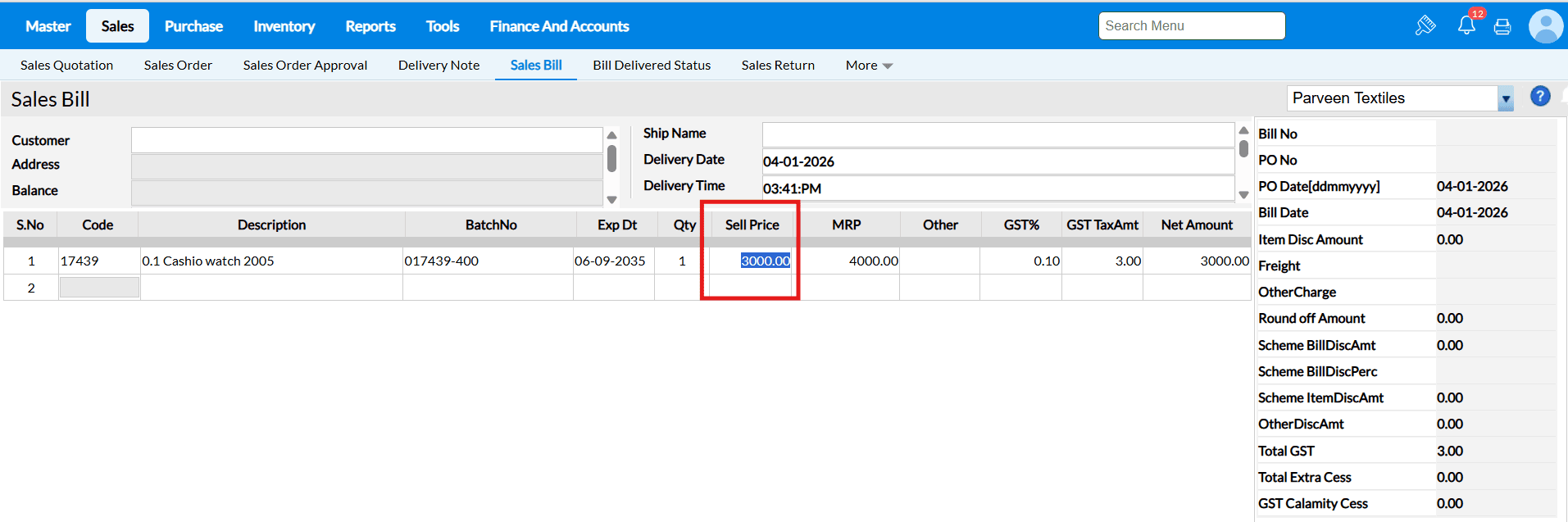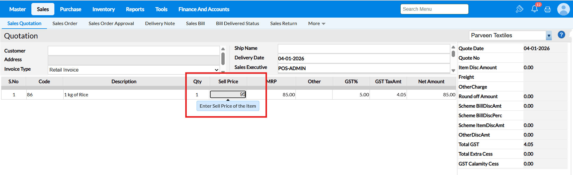 Answer : When the "Allow Rate Edit in Sales" configuration is enabled, the cursor in the Sales Bill screen will automatically move to the Selling Price field after selecting an item, allowing you to edit the selling price.
