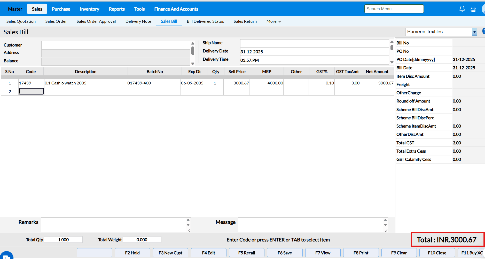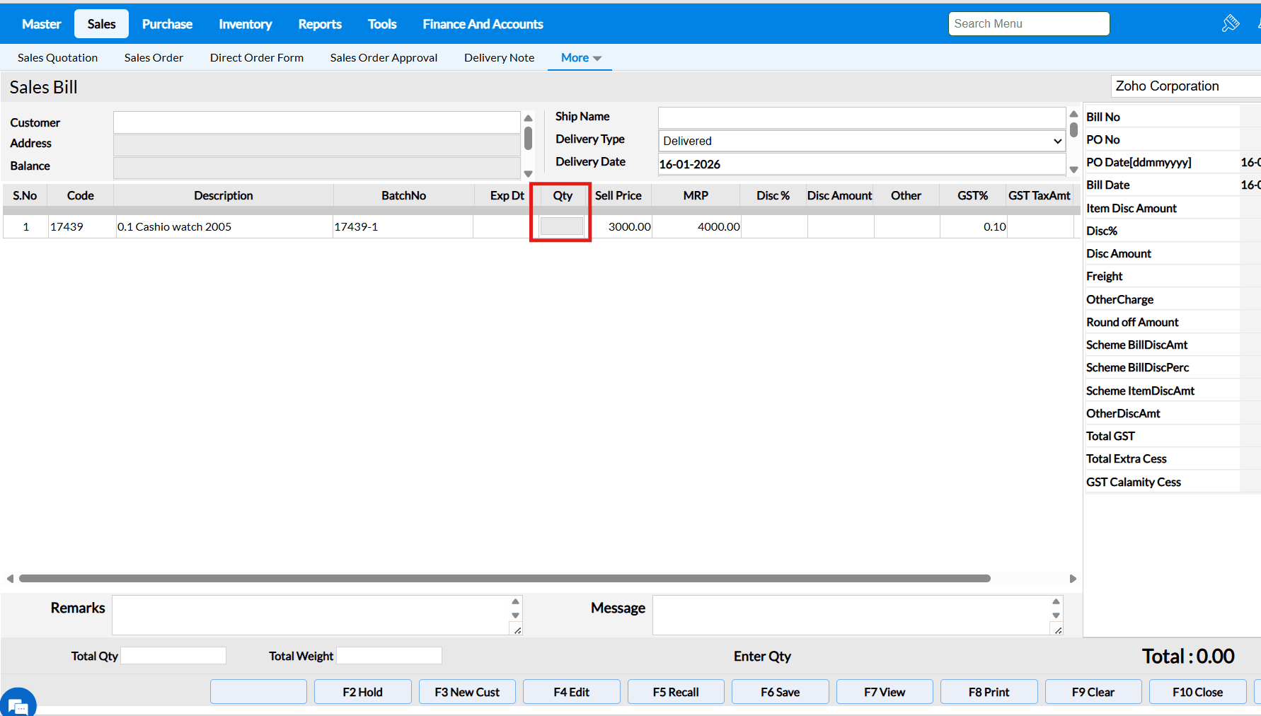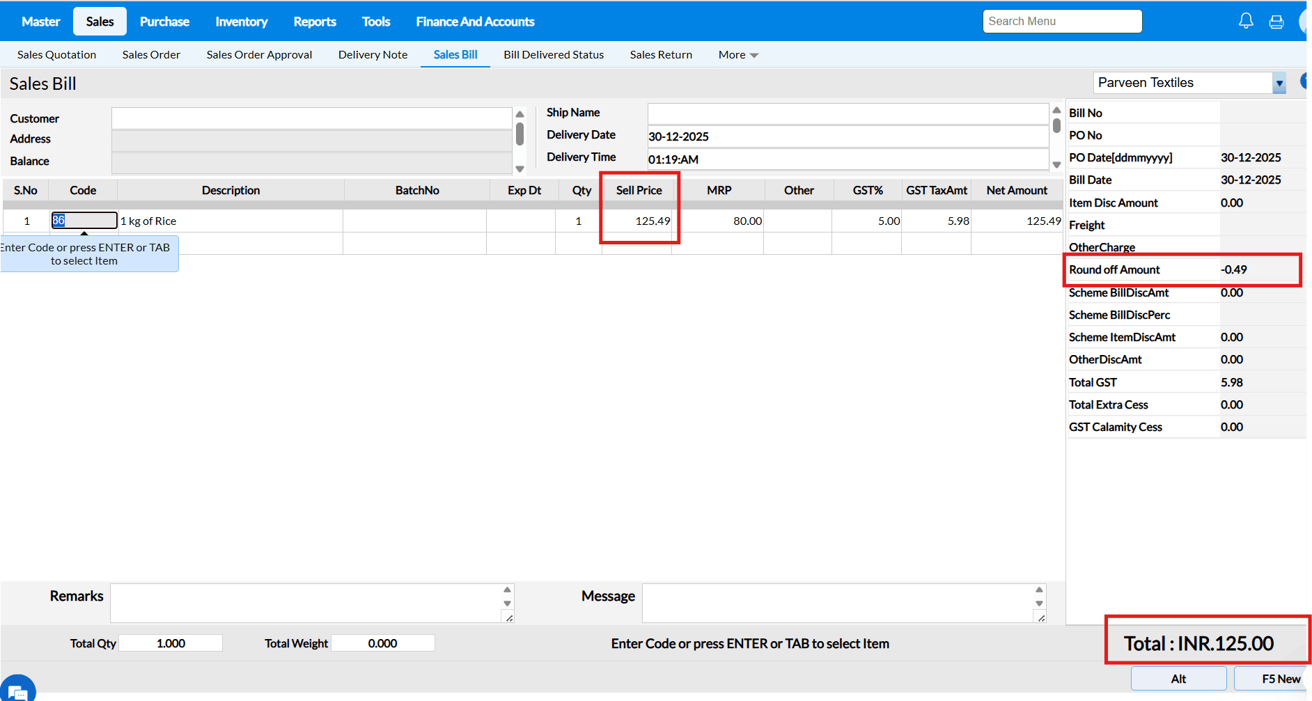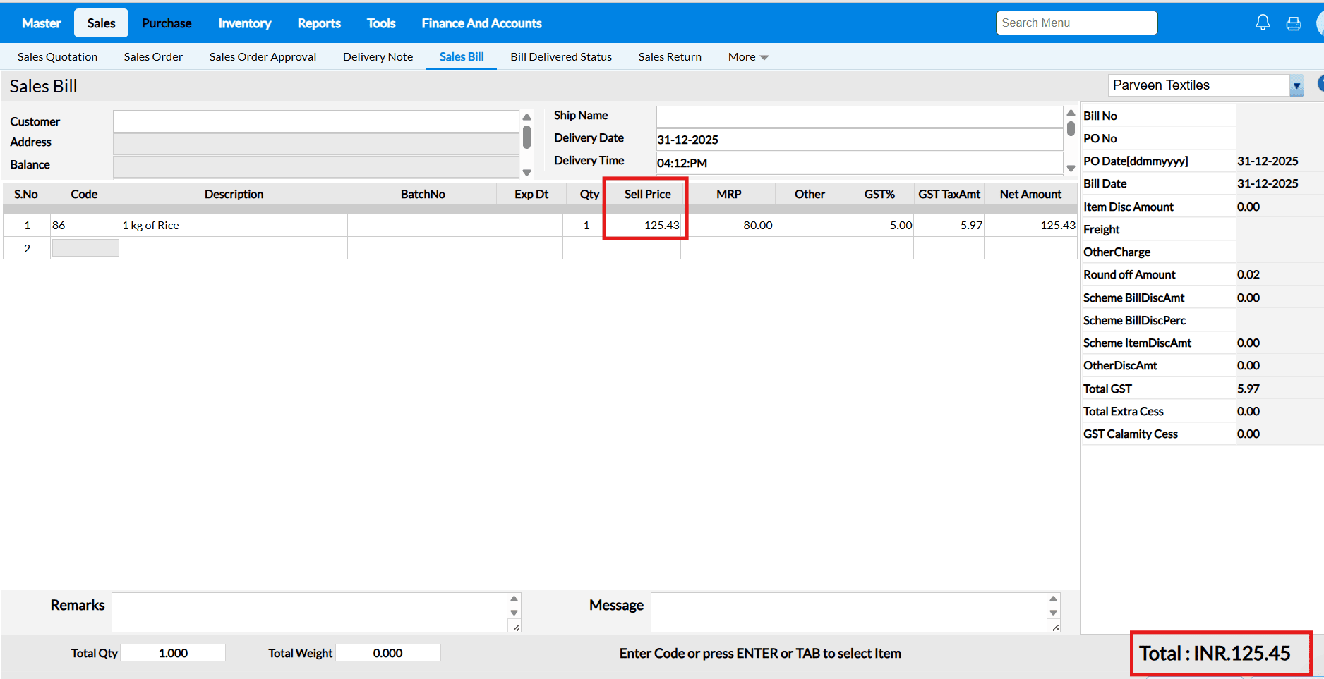Answer : When the "Allow Rate Edit in Sales" configuration is enabled, the cursor in the Sales Bill screen will automatically move to the Selling Price field after selecting an item, allowing you to edit the selling price.