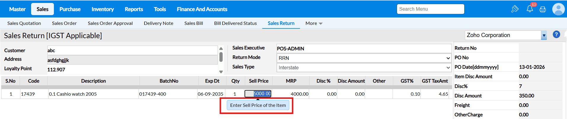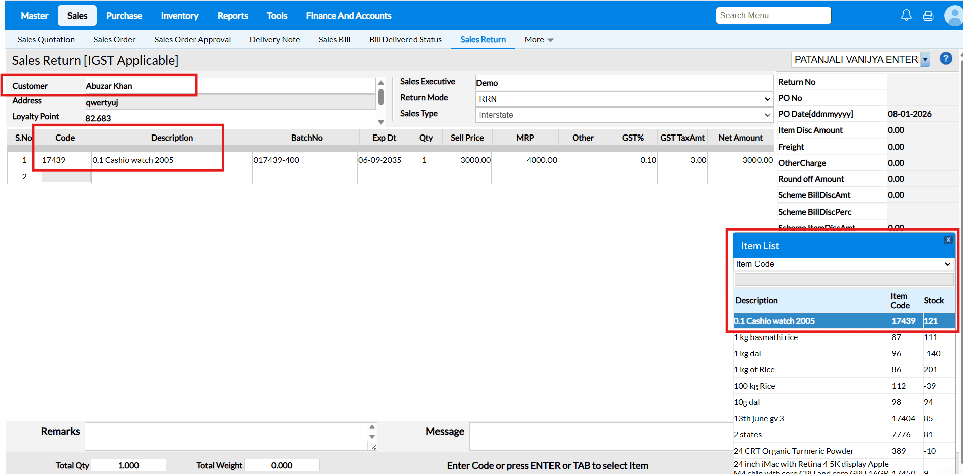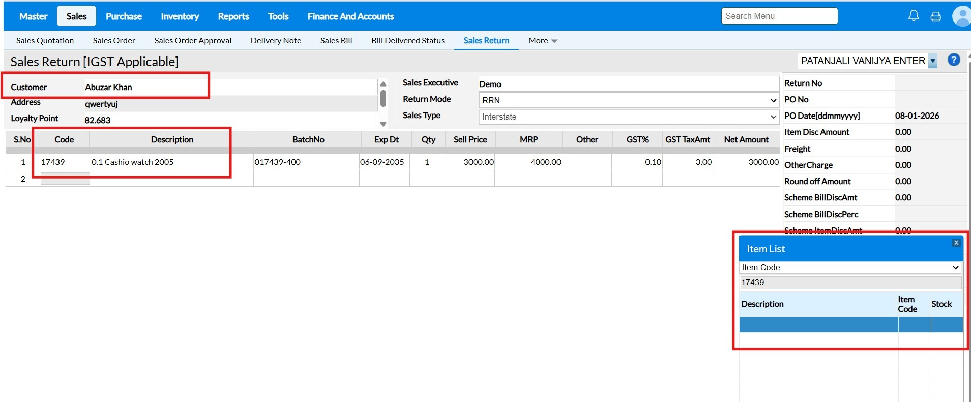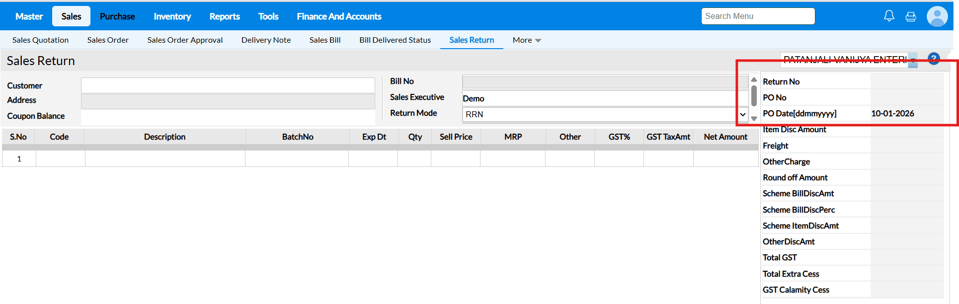 Sale Return Based on Bill No – Enabled