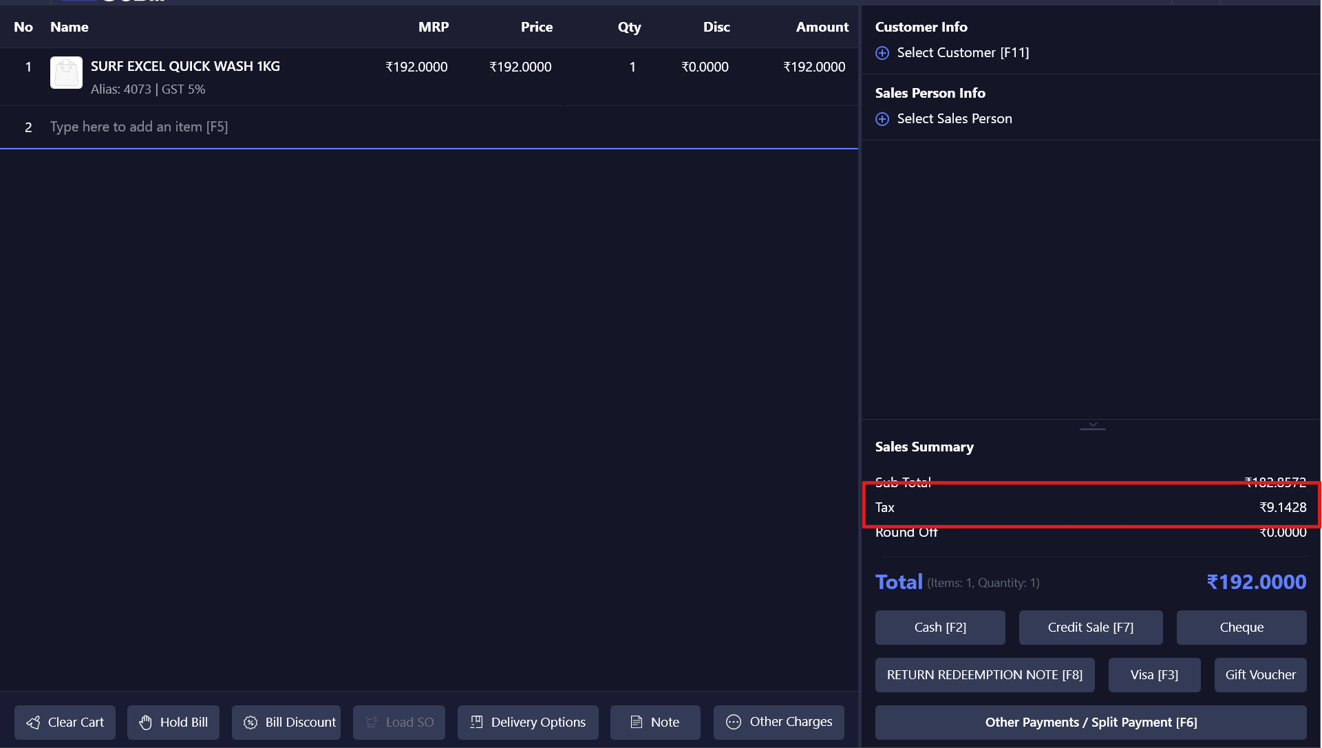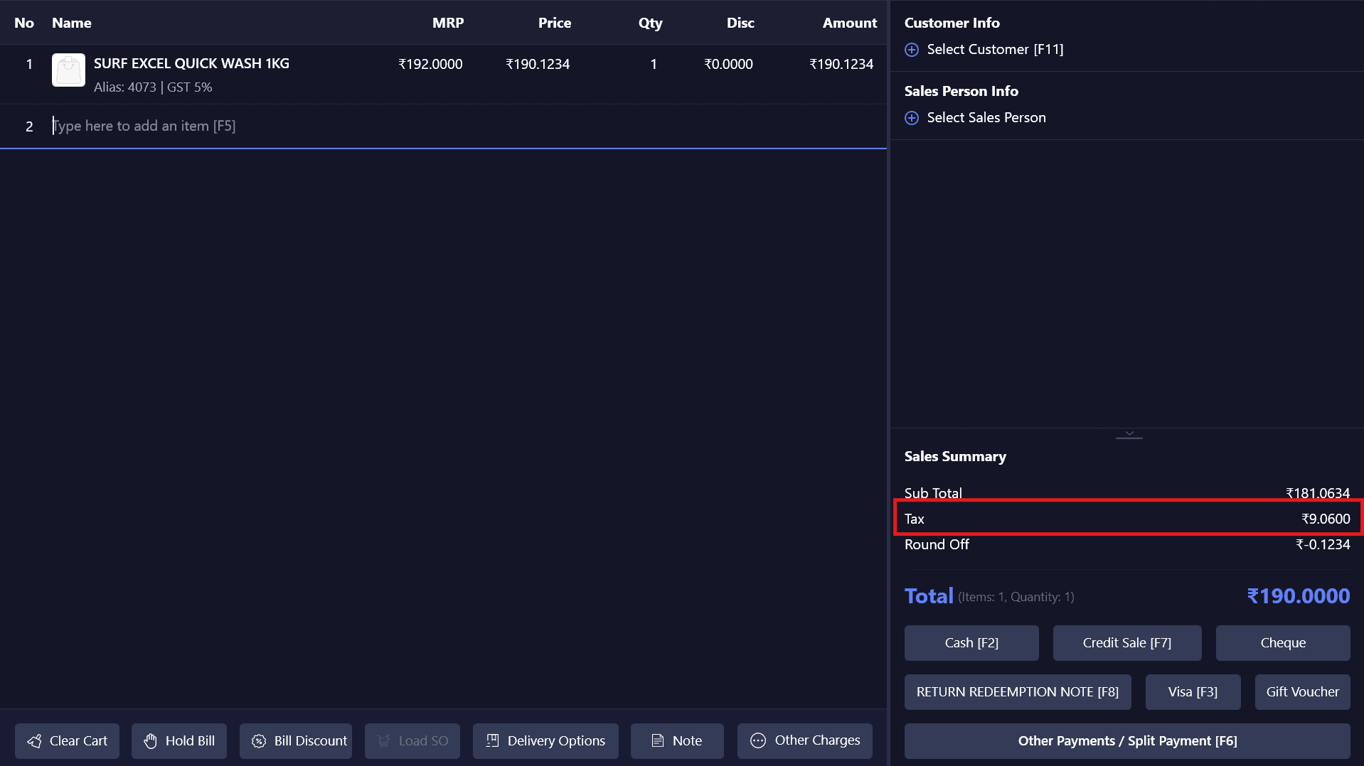 * The Round-off option is configured in POS Settings / Billing Configuration and applies automatically during billing.