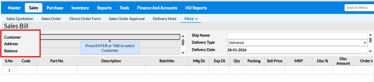 After selecting the Customer, the system cursor will automatically move to the Billing To field.