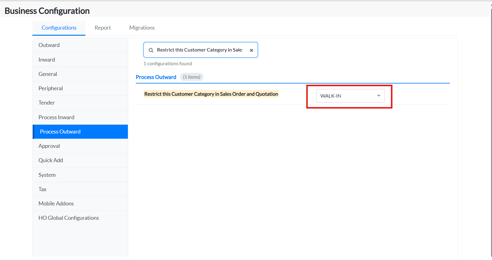 → As an example, Mapped the 'Walk-In' category against the 'Restrict this Customer Category in Sales Order and Quotation' configuration and attached the before and after configuration details.