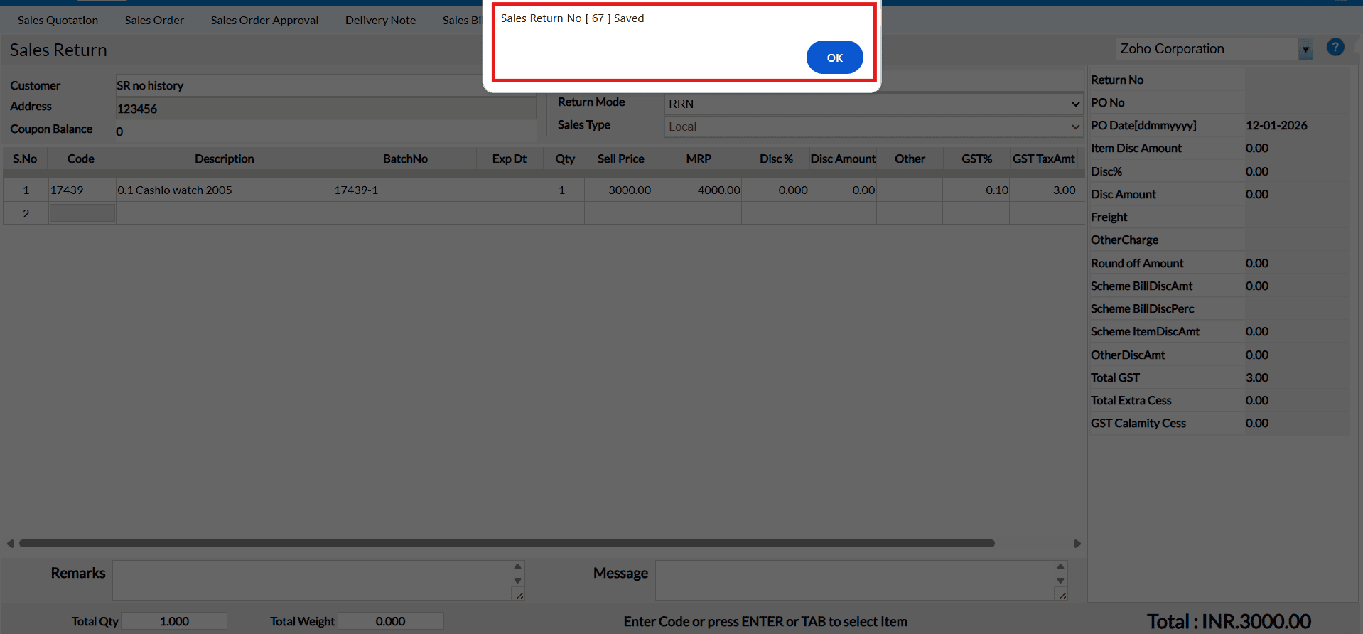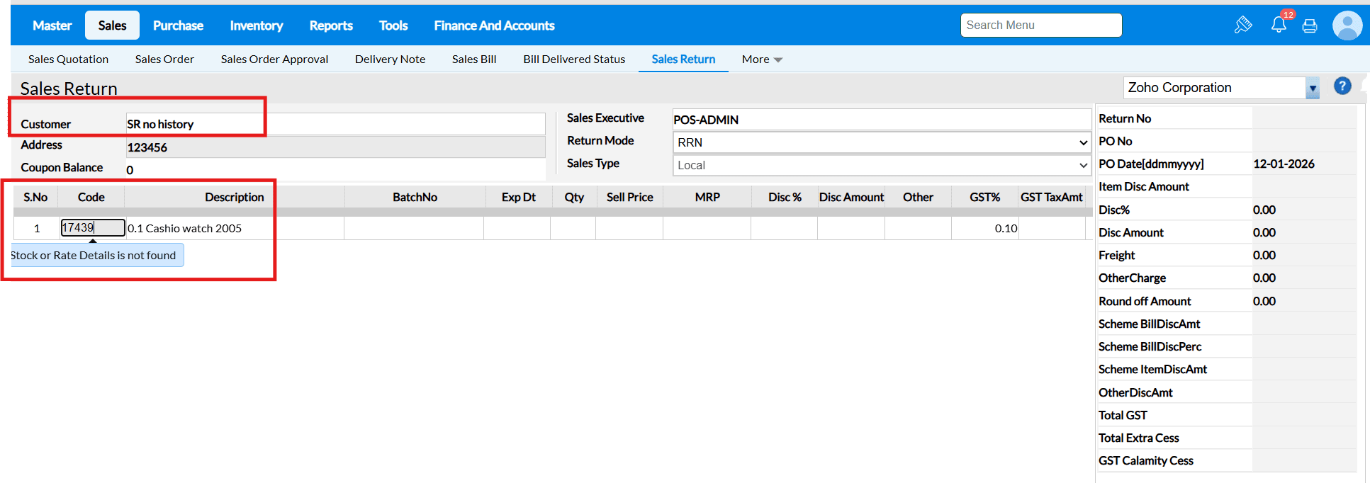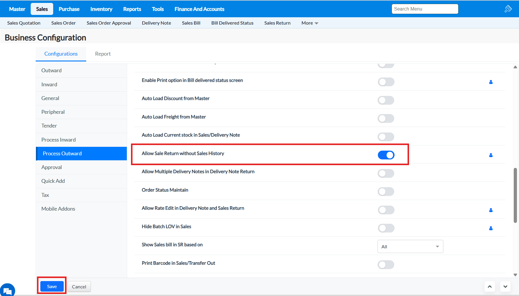 Sale Return Based on Bill No – Disabled