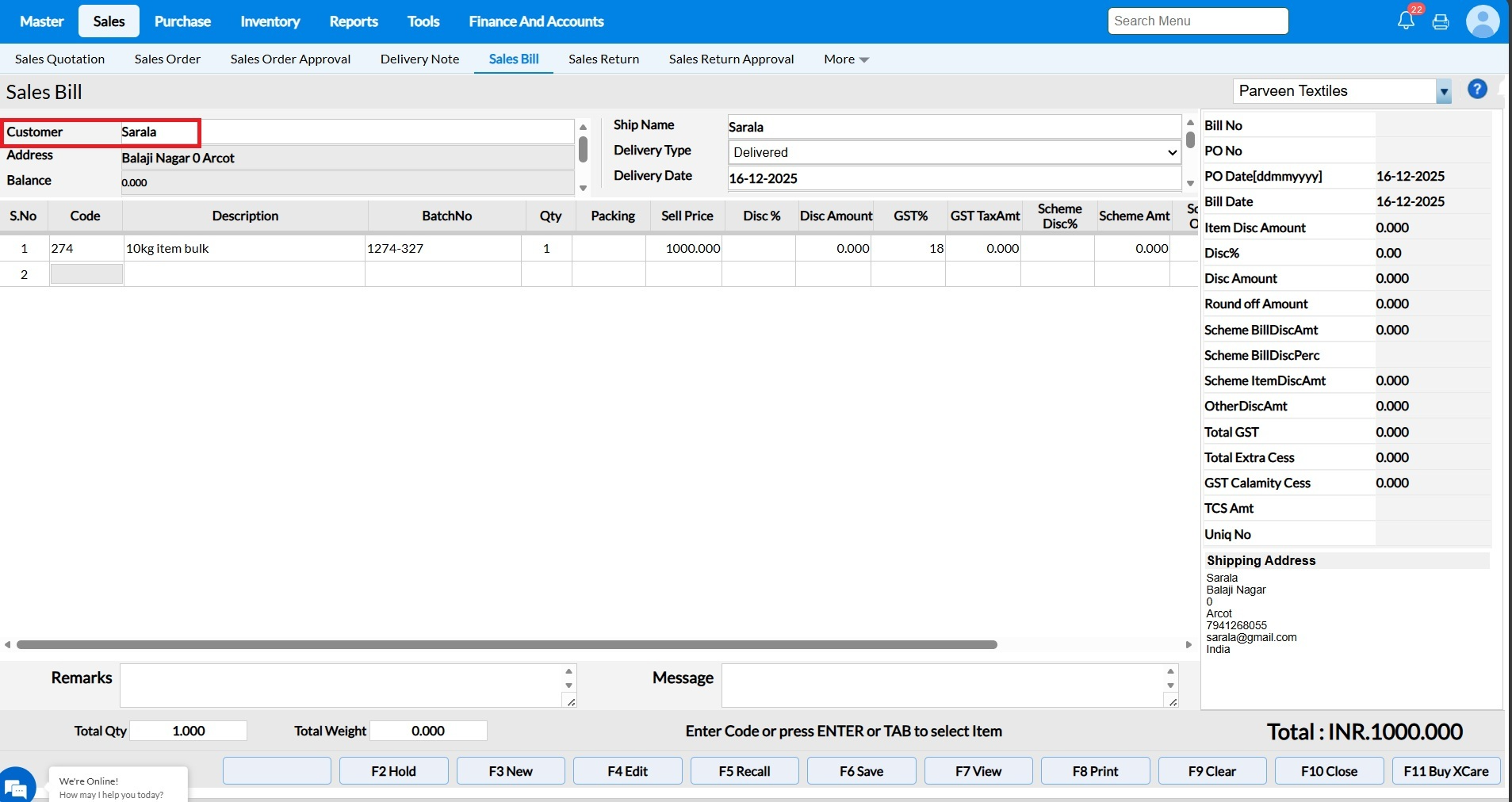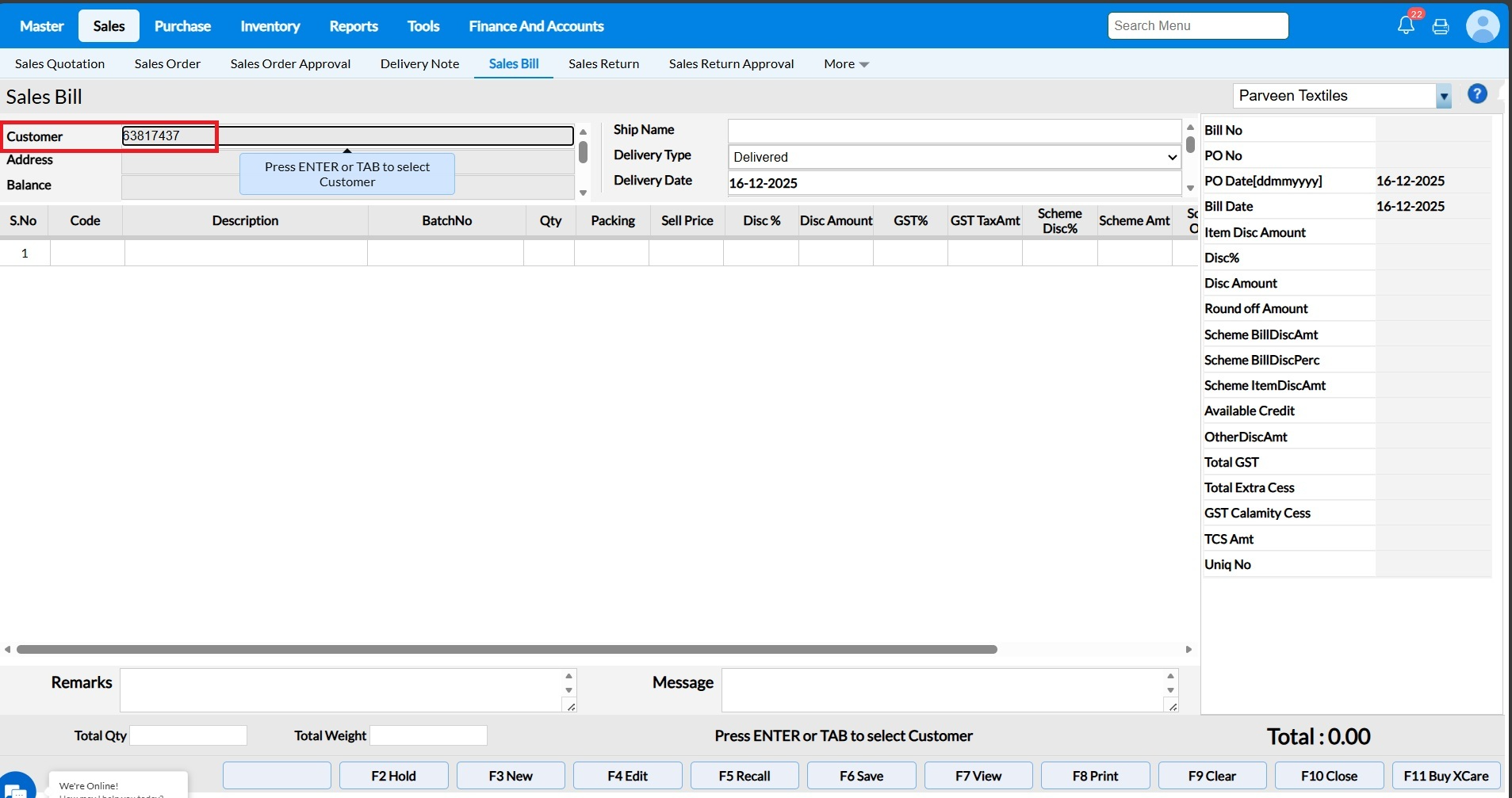 Step 6:Go to Sales-> Sale Bill. Scan the card in the customer field the name will be loaded automatically