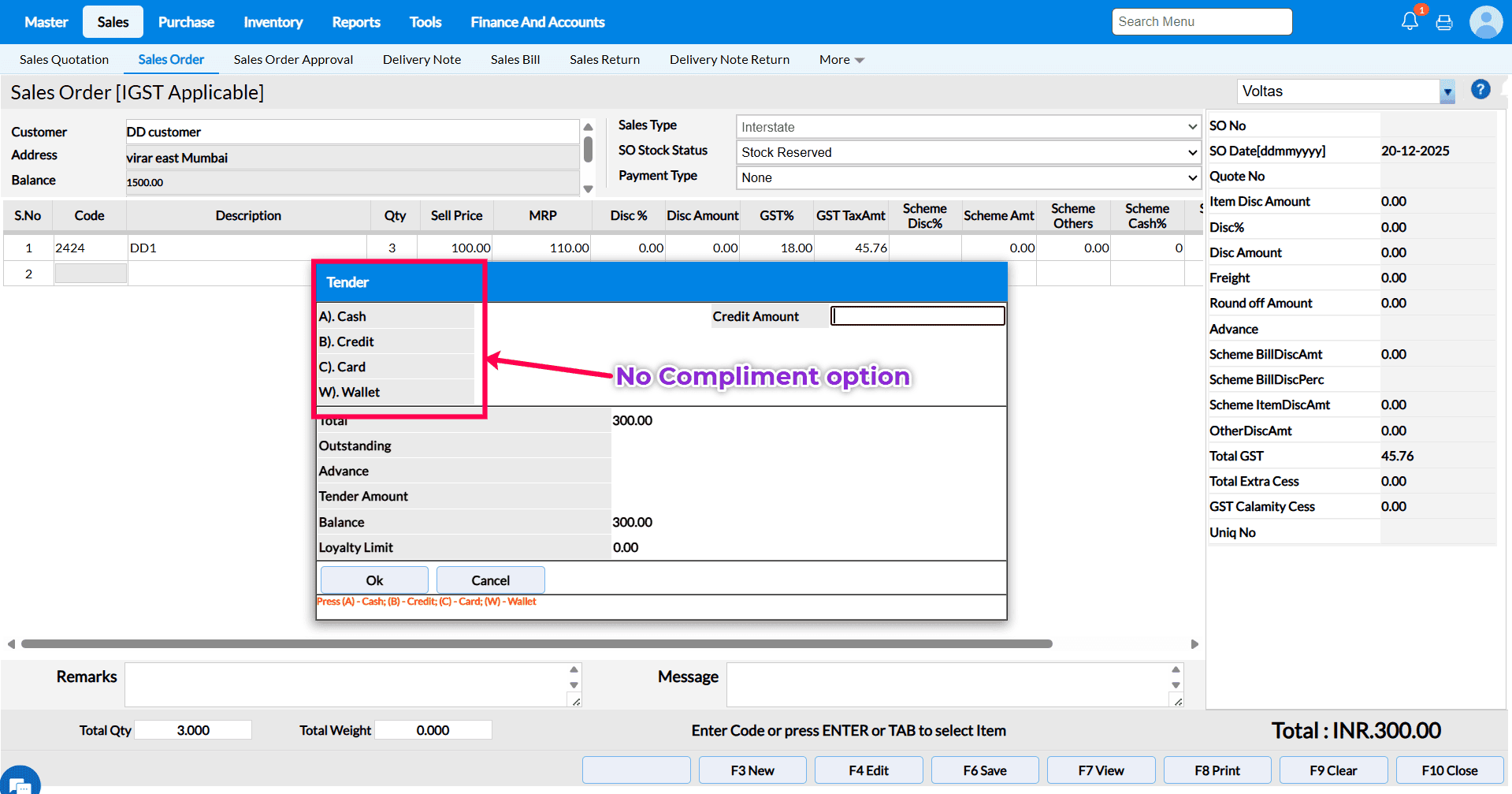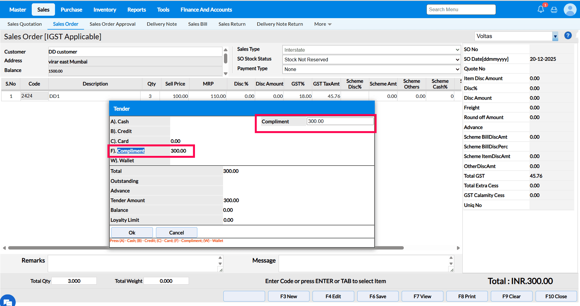 Note - To enable (Allow Compliment Tender in Sales Order ) Configuration Kindly Reach Support