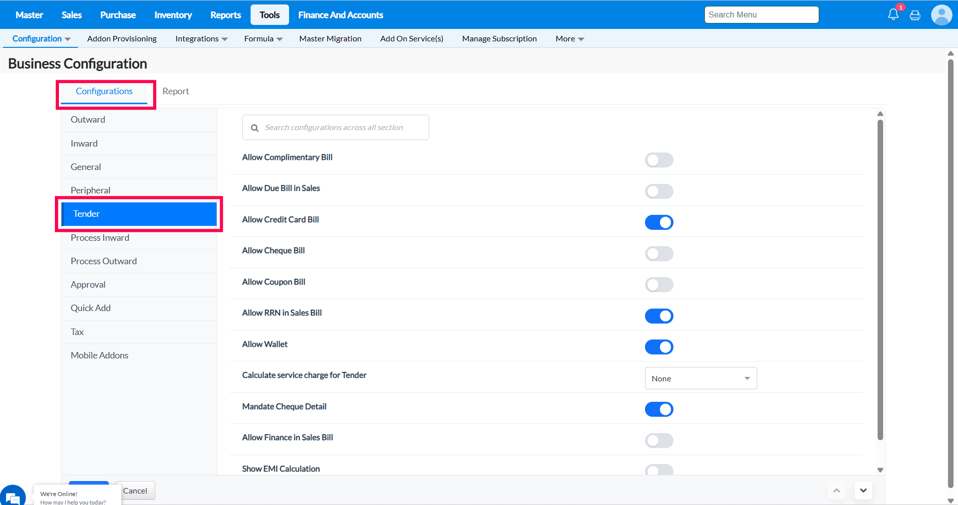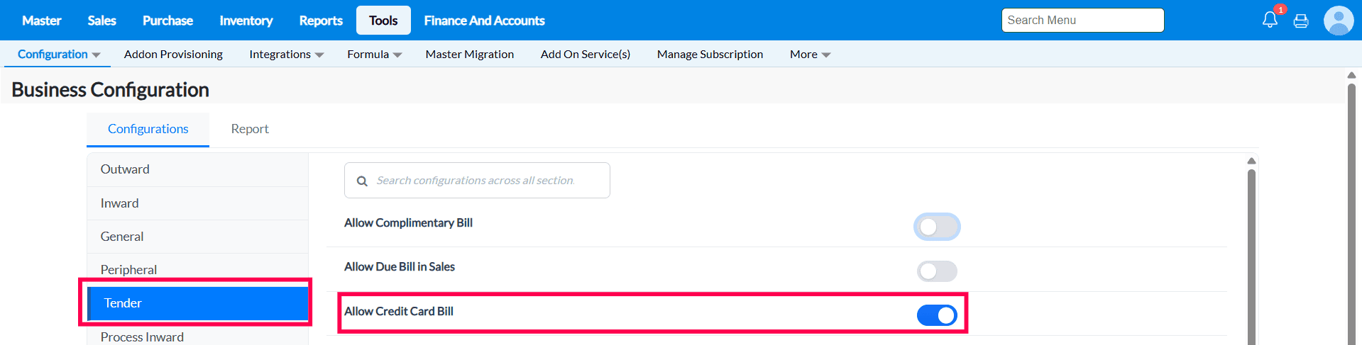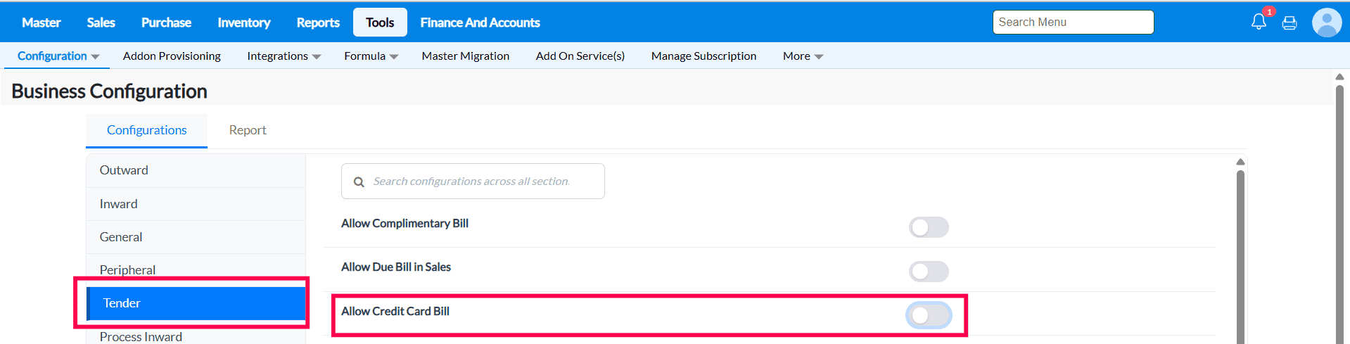 2. Under the Configurations tab, click on the Tender tab and all the configurations under this tab will be listed.
