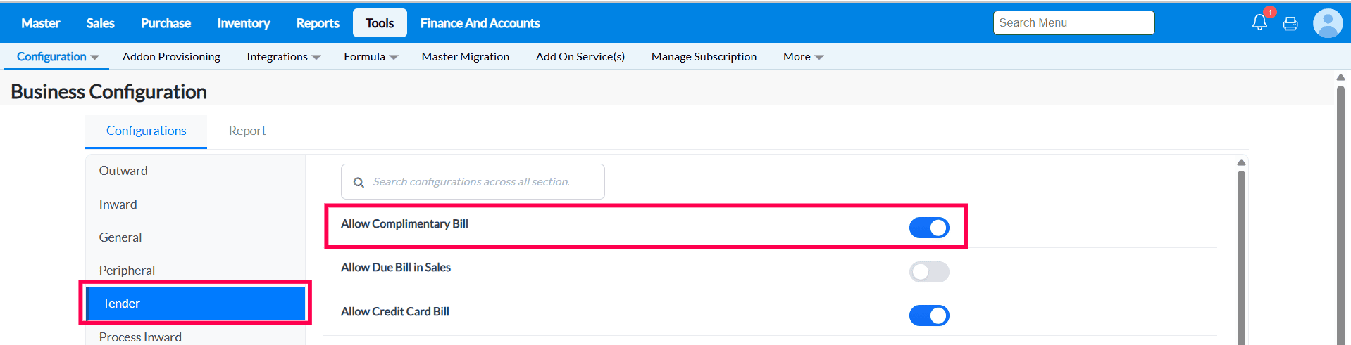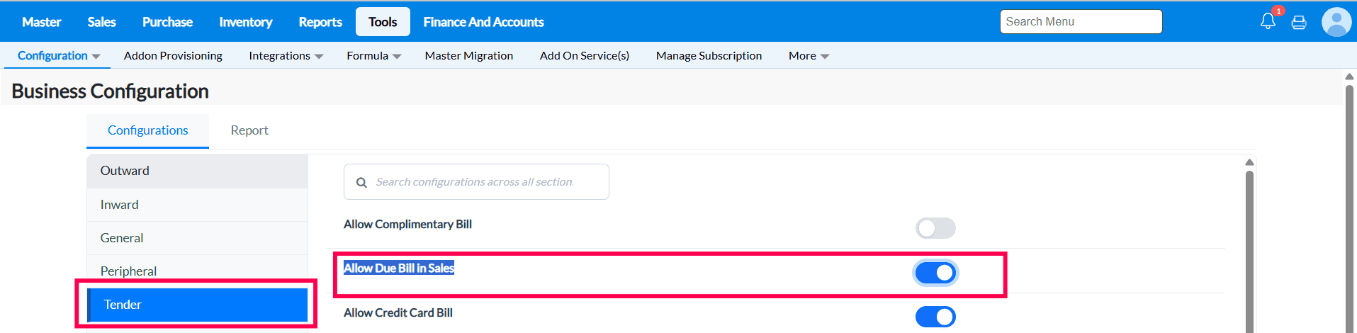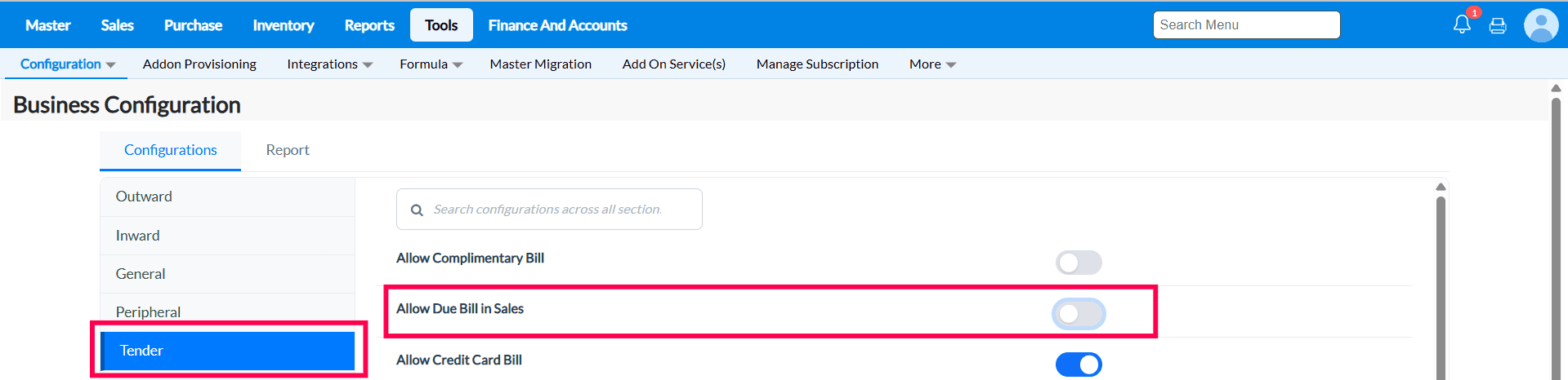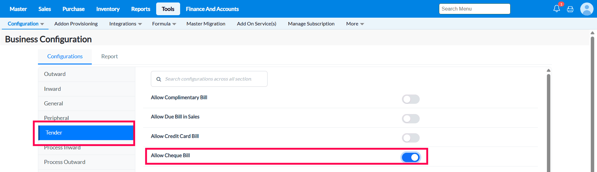 2. Under the Configurations tab, click on the Tender tab and all the configurations under this tab will be listed.
