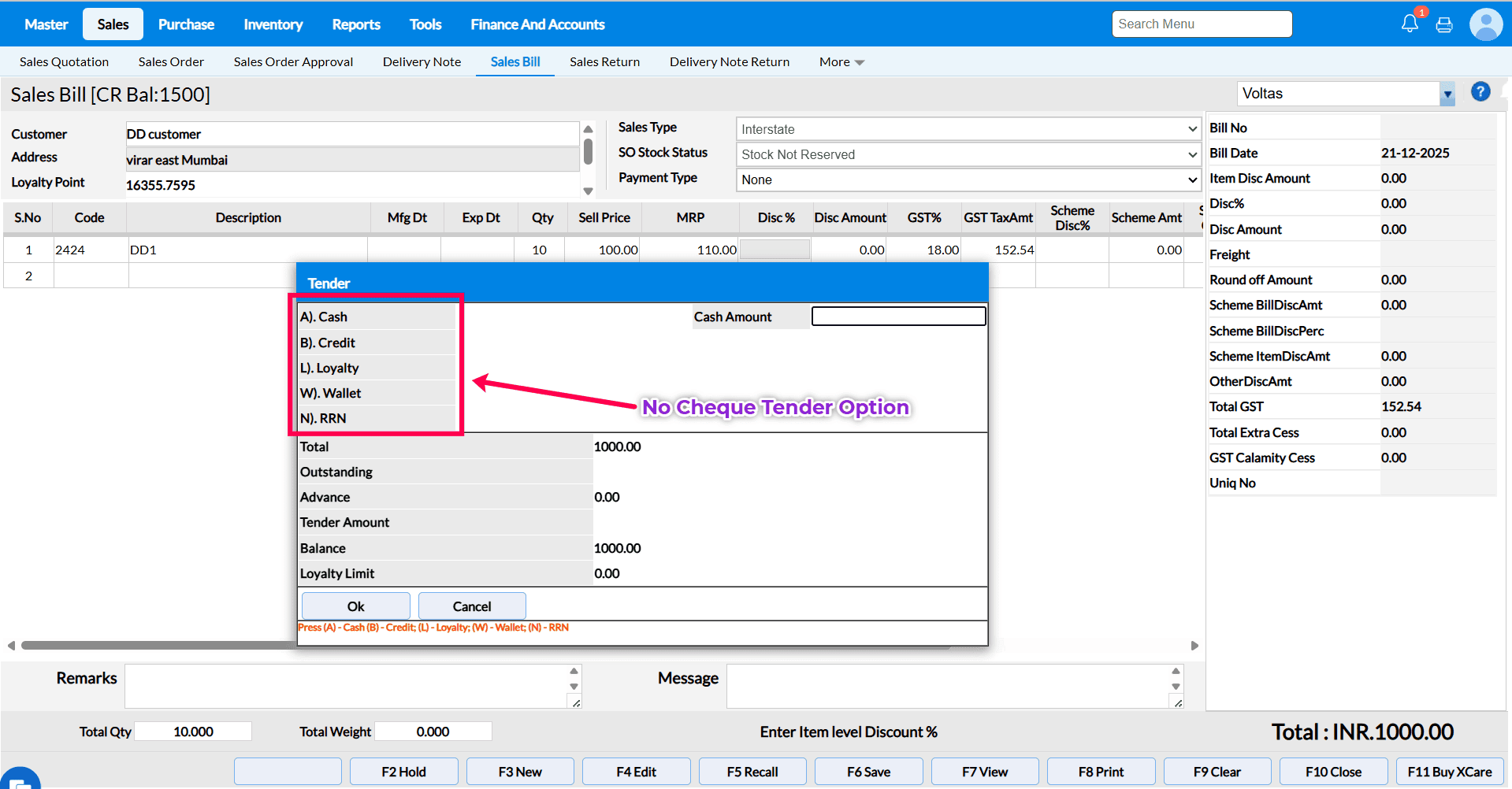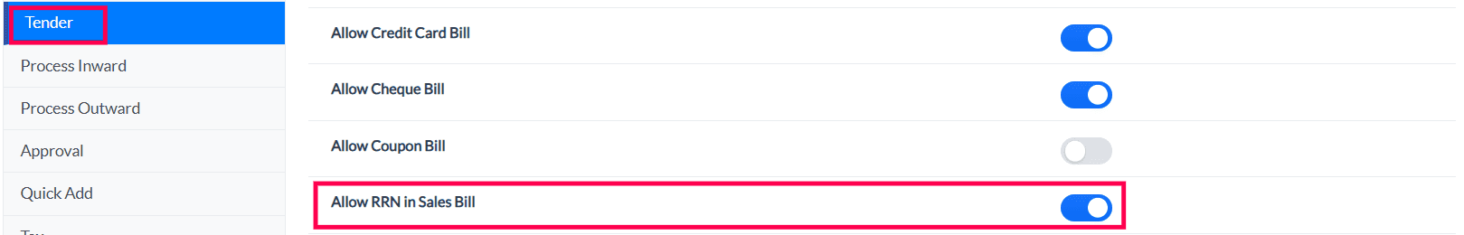 Purpose: RRN is used when you want to exchange any item while doing sales return.1. If you tick this checkbox: the system enables the RRN Option in Tender during billing.