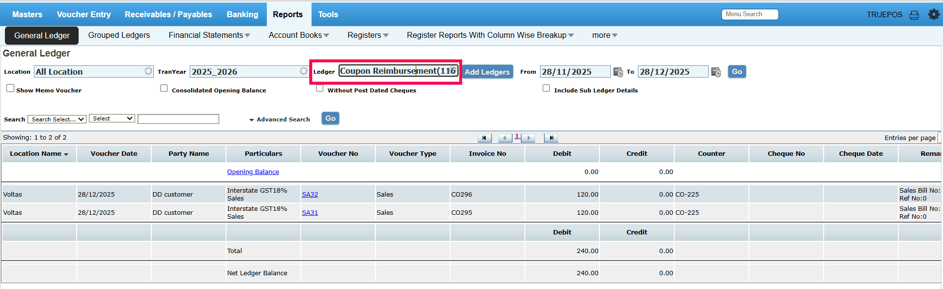 2. General Ledger In accounts and finance you can track the Coupon Bill in Coupon Reimbursement(116) Ledger.