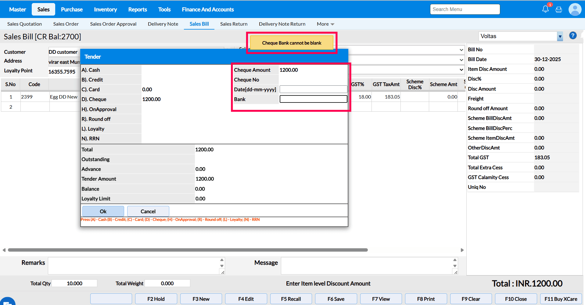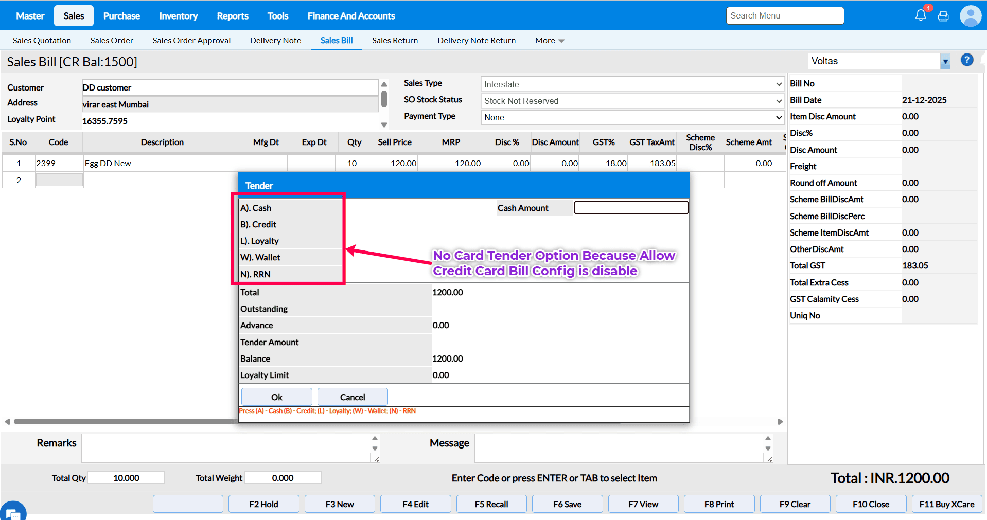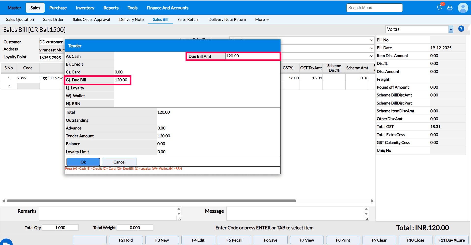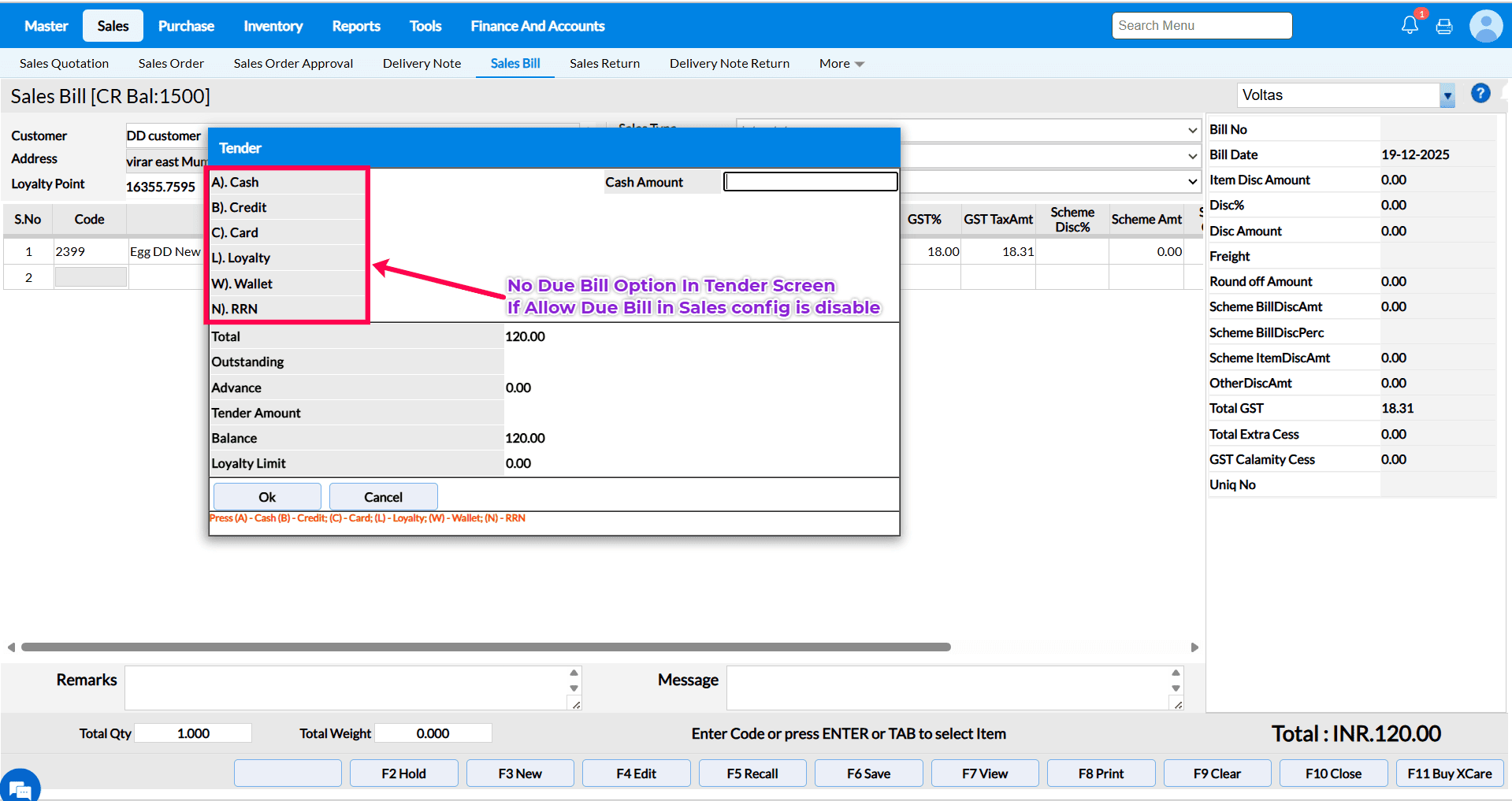 2. If you untick/clear this checkbox: the system Disable theDue Bill Tender during billing