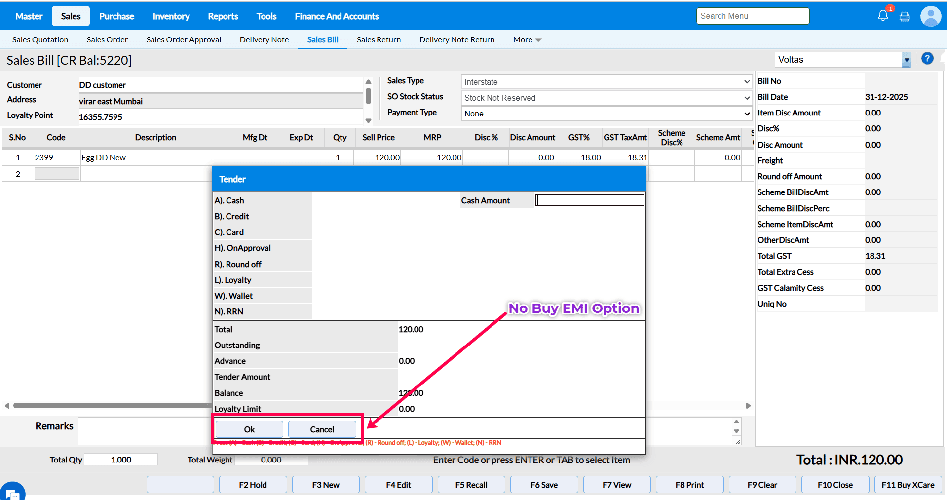 2. If you untick/clear this checkbox: the system Disable the Buy EMI Option in Tender during billing.