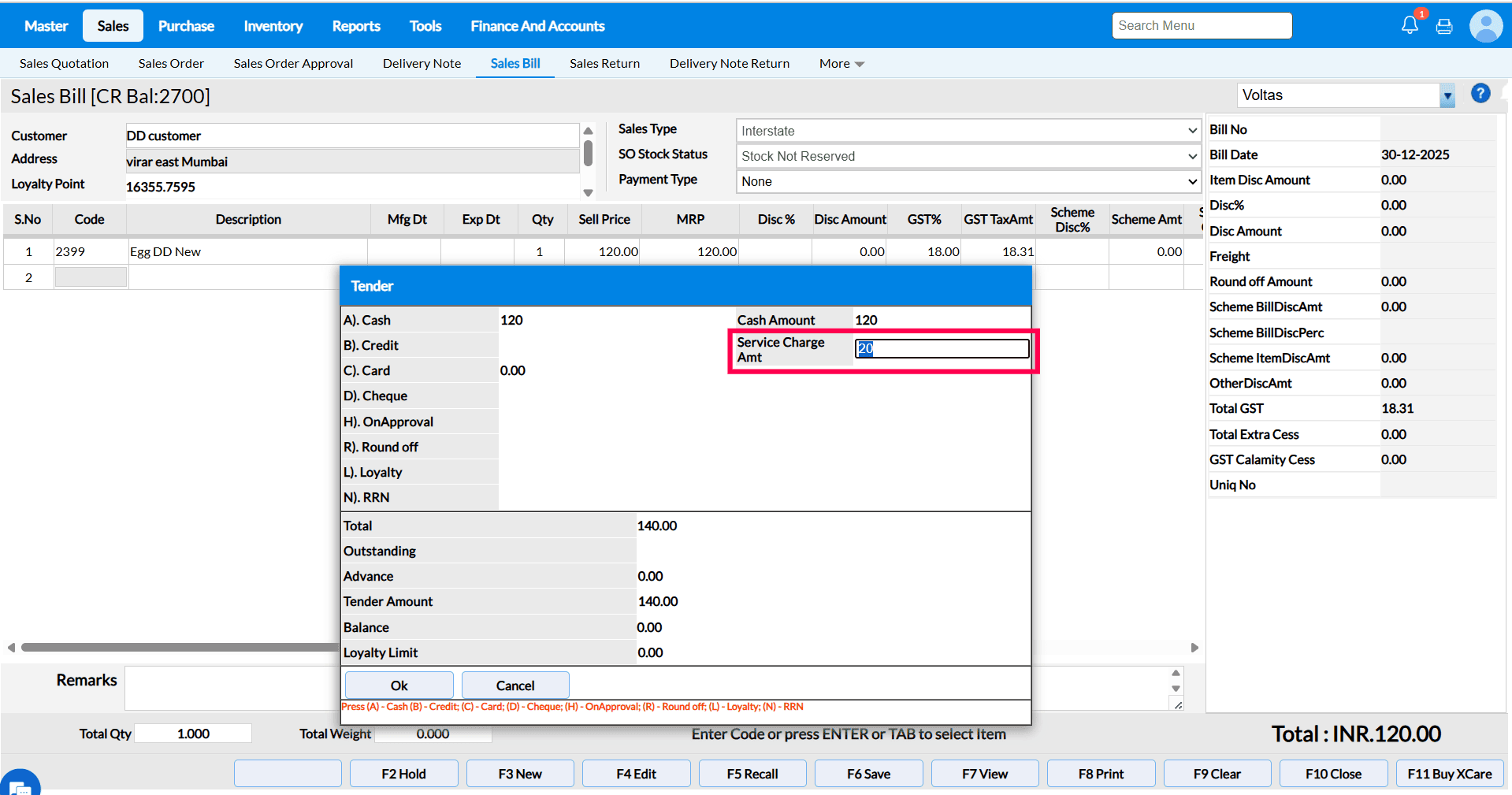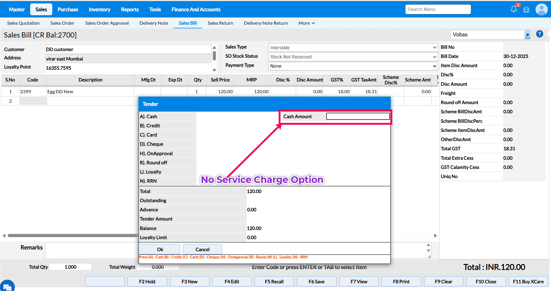 2. If you Select None Option: the system Disable the Service Charge Option in Tender during billing.