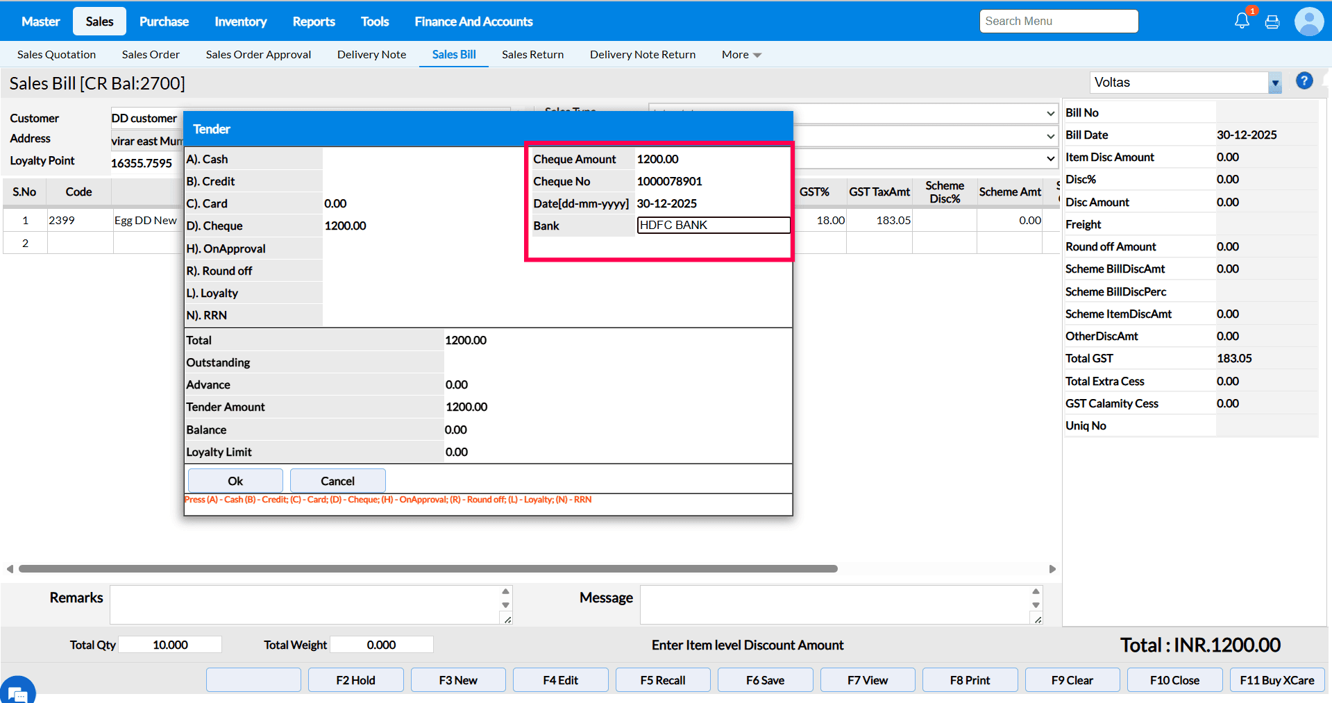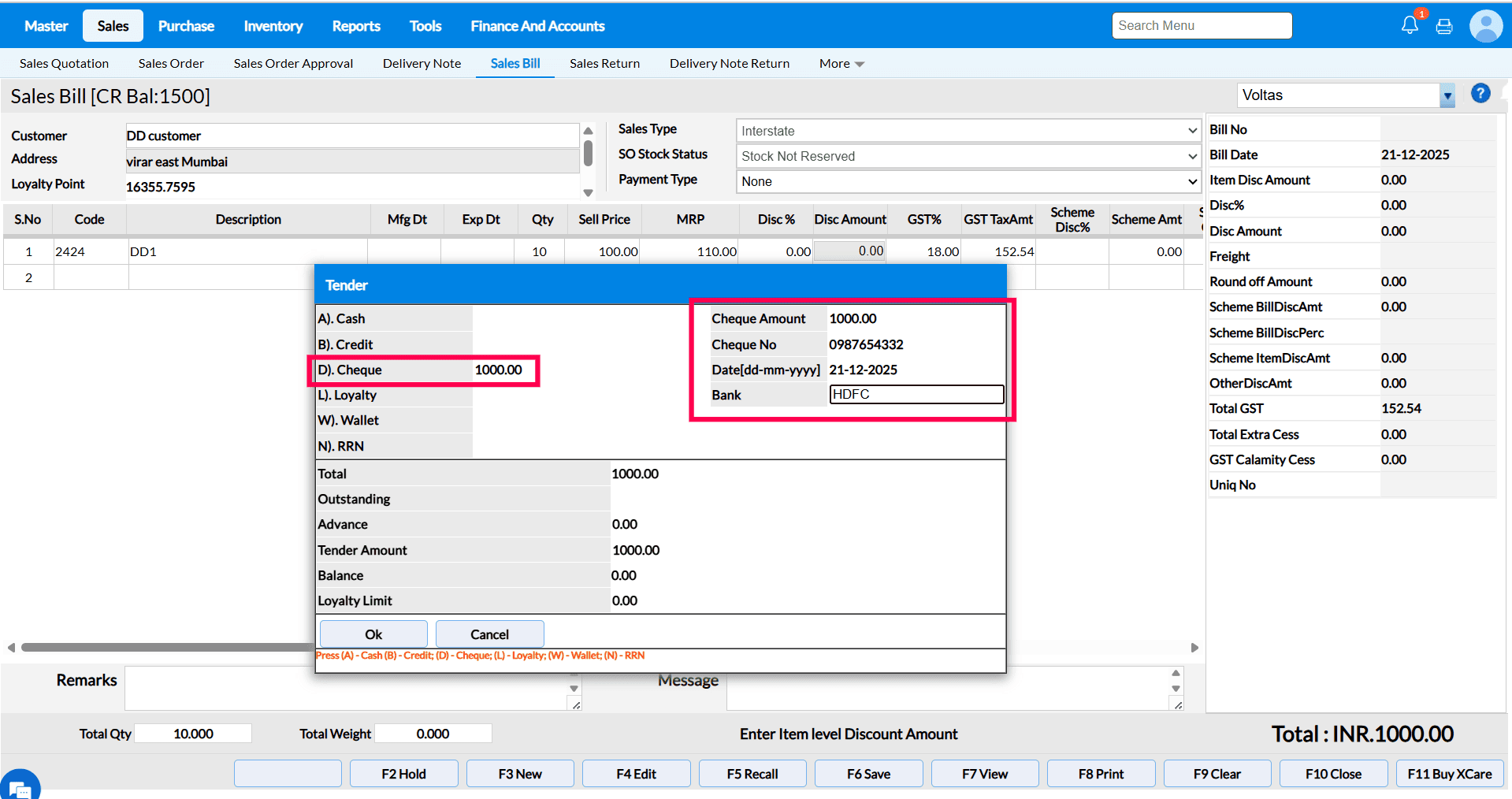 1. If you tick this checkbox: the system enables the Cheque Tender during billing.