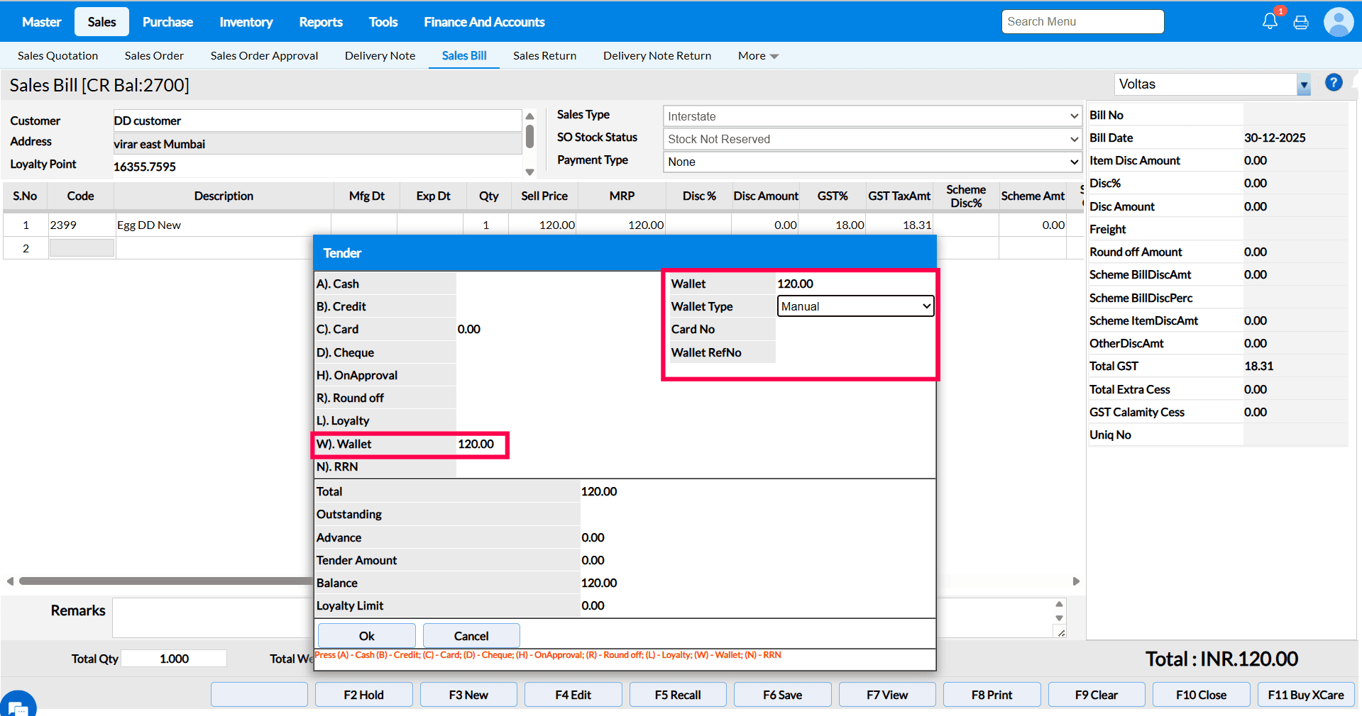 1. If you tick this checkbox: the system enables the Wallet Option in Tender during billing.