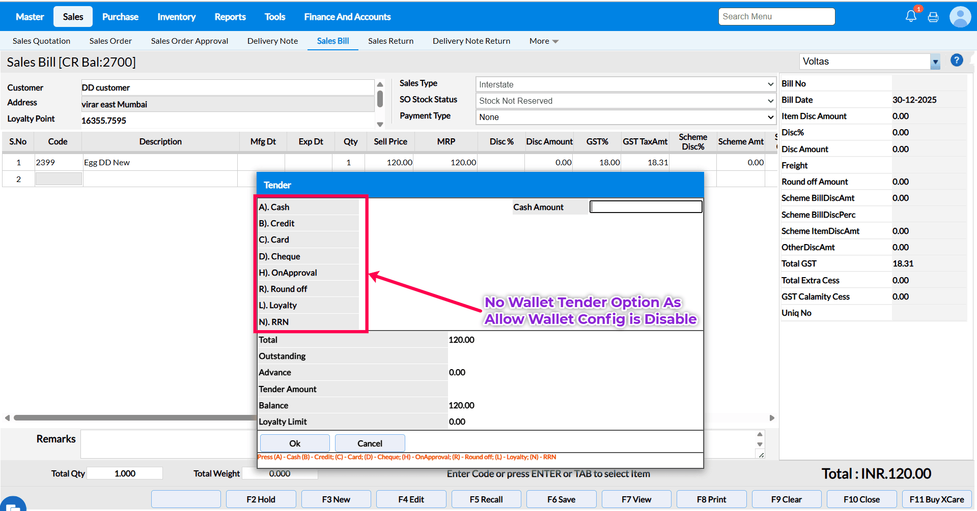 2. If you untick/clear this checkbox: the system Disable the Wallet Option in Tender during billing.