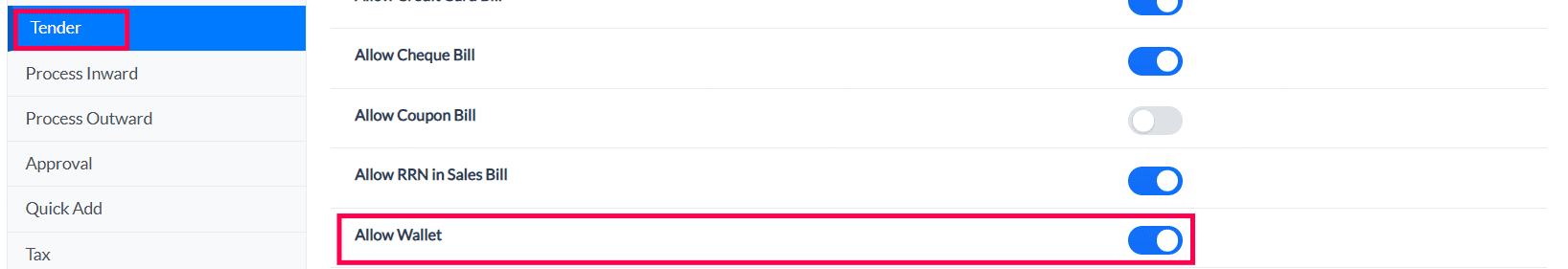 This option enables wallet payments during the billing process. When selected, the Wallet option appears on the tender screen, allowing users to accept and record payments made through digital wallets. It helps provide convenient payment options and ensures accurate tracking of wallet transactions in sales reports.