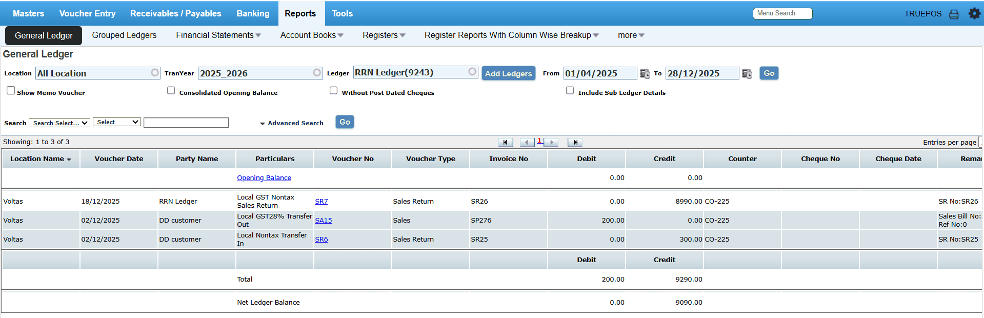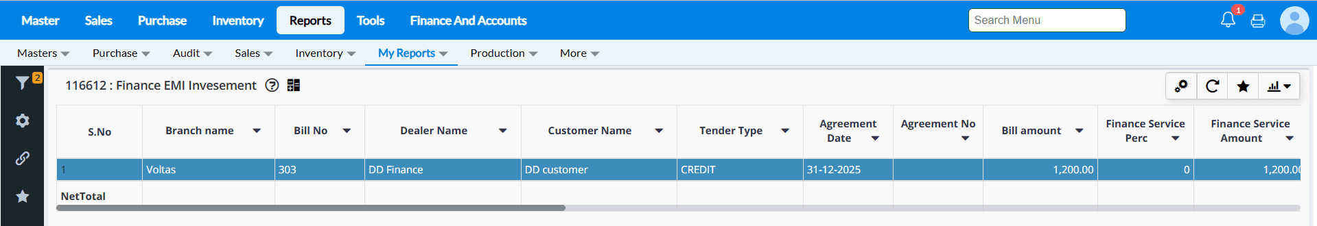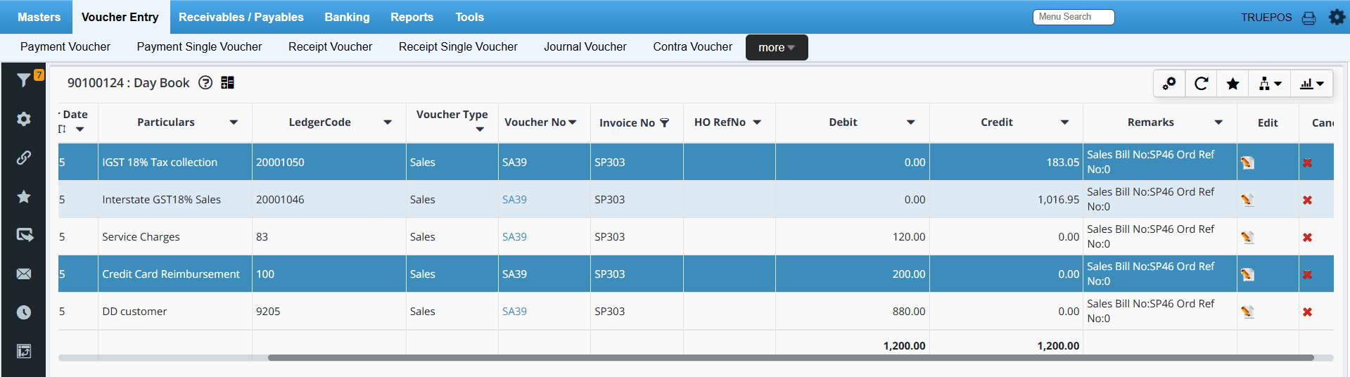 3. The amount received from the finance institute is saved as a credit entry and can be viewed in the Day Book report under the Finance & Accounts module.