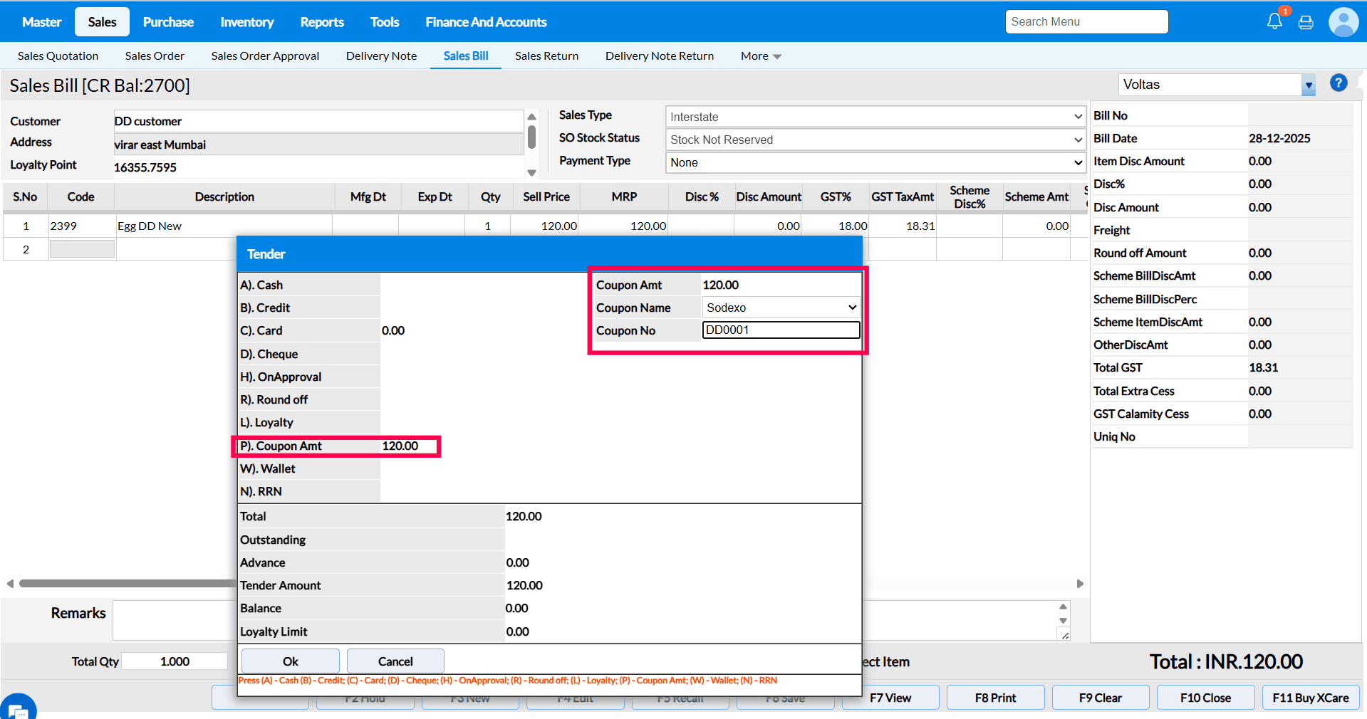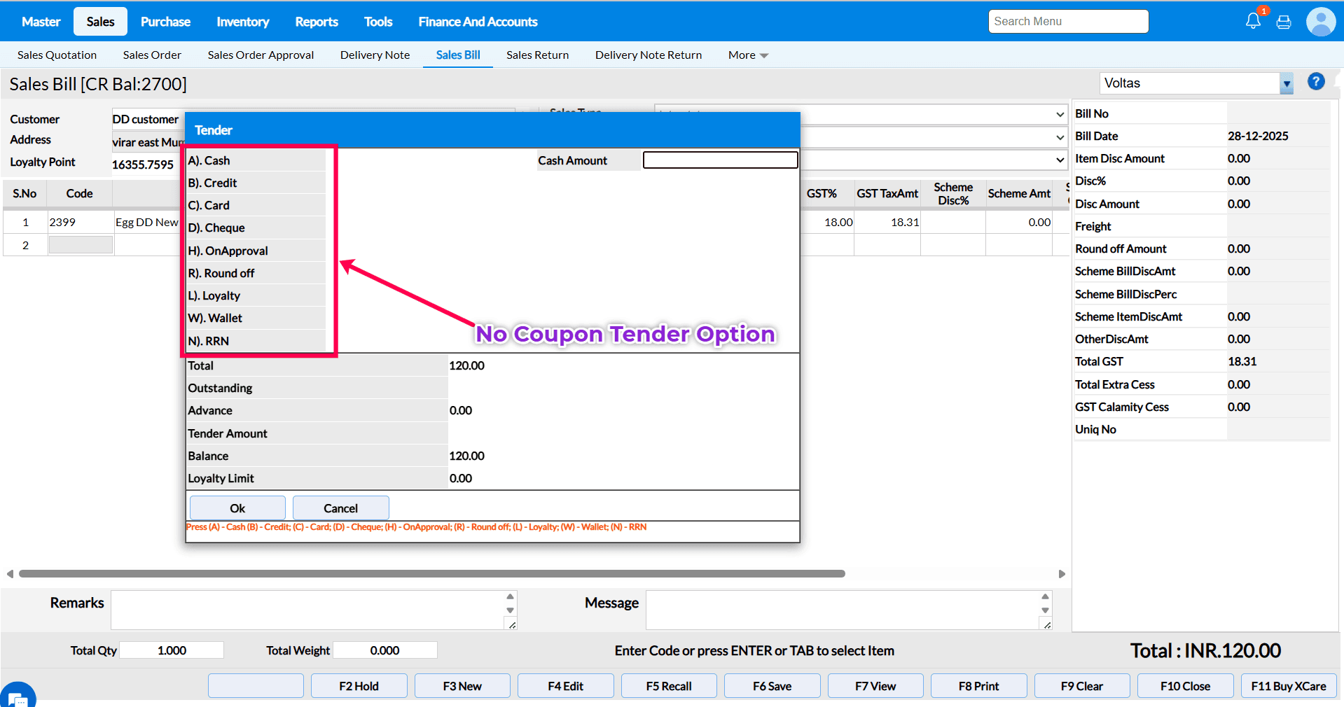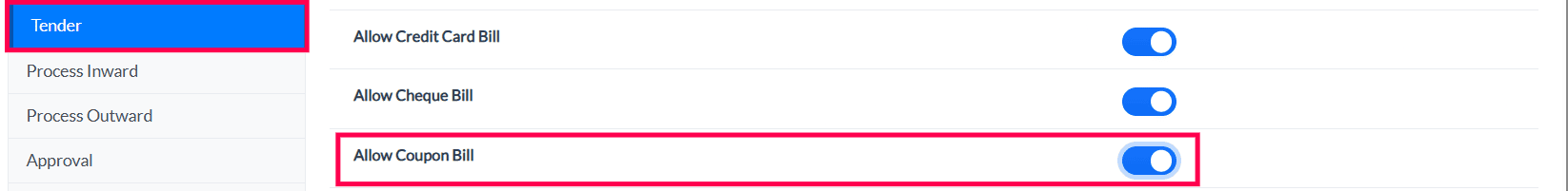 Purpose - This option enables coupon payments during the billing process. When selected, the Coupon option appears on the tender screen, allowing users to accept and record coupon payment details from customers. It helps manage promotional offers properly and ensures accurate tracking of coupon-based sales in reports.1. If you tick this checkbox: the system enables the Coupon Option in Tender during billing.