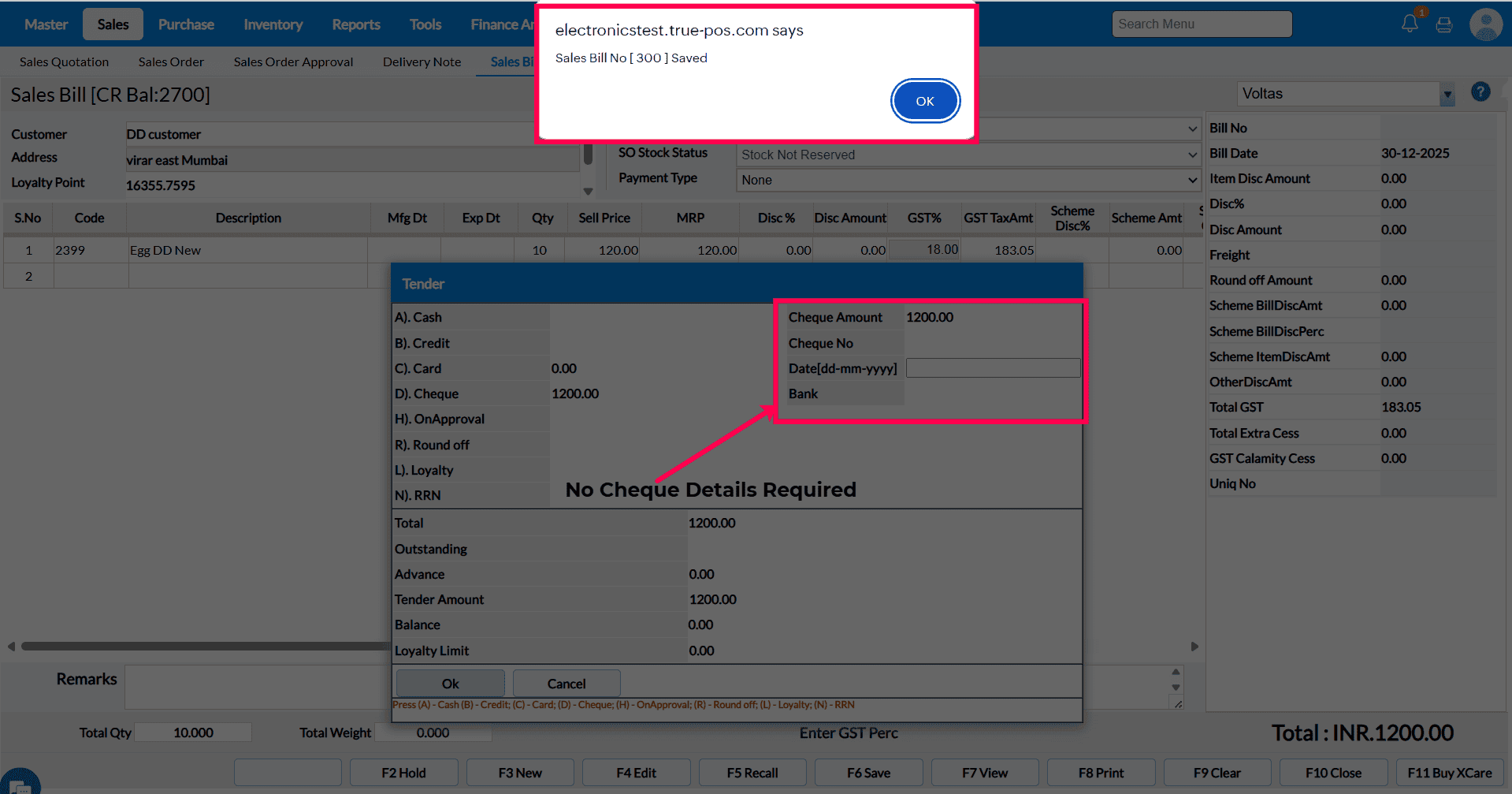 2. If you Untick/ Clear this checkbox: the system Allow To save the Bill Without Cheque Details.