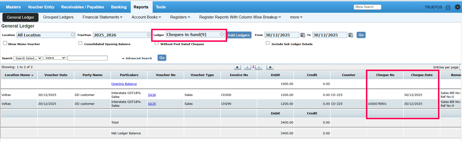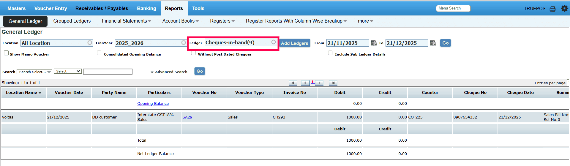 2. General Ledger In accounts and finance you can track the Cheque Bill in Cheque in hand Ledger.