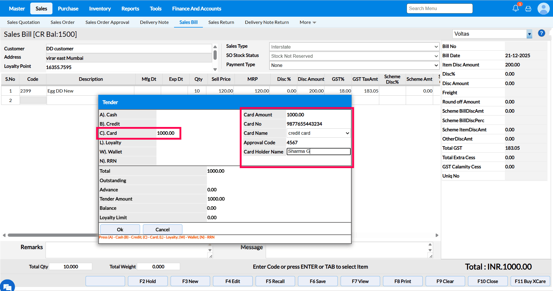 Purpose - This option is used to enable credit card payments in the sales process. When the Allow Credit Card Bill checkbox is selected, the Credit Card option appears on the tender screen, allowing users to record credit/Debit card payment details against sales bills. The purpose is to provide customers with a convenient payment option, ensure accurate recording of card transactions, and help businesses track and reconcile credit card sales properly in reports and accounts.
