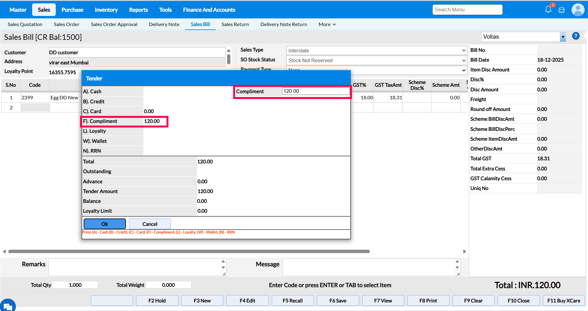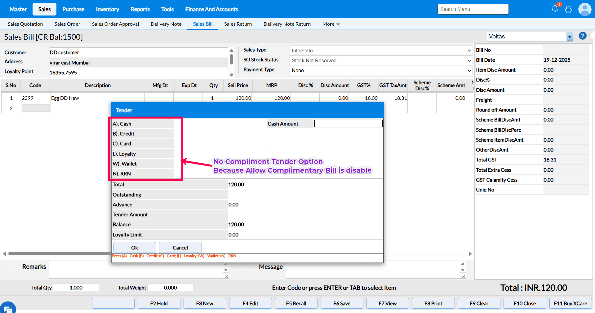 1. If you tick this checkbox: the system enables the Complimentary Tender during billing
