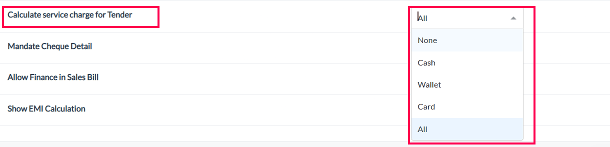 Purpose : This option allows the system to apply a service charge for selected payment types like wallet or cash Etc. You can choose which tender requires a service charge, and the system will automatically calculate and add it during billing.