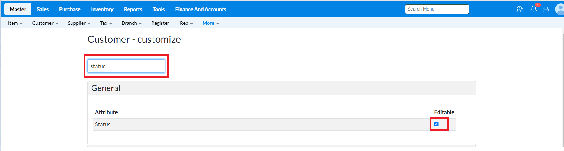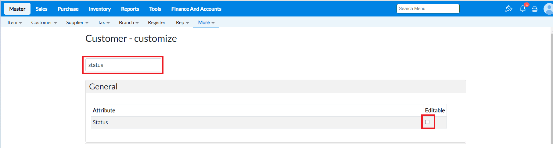 Example: To disable editing for the Status field in Customer Master, type Status in the search bar.
