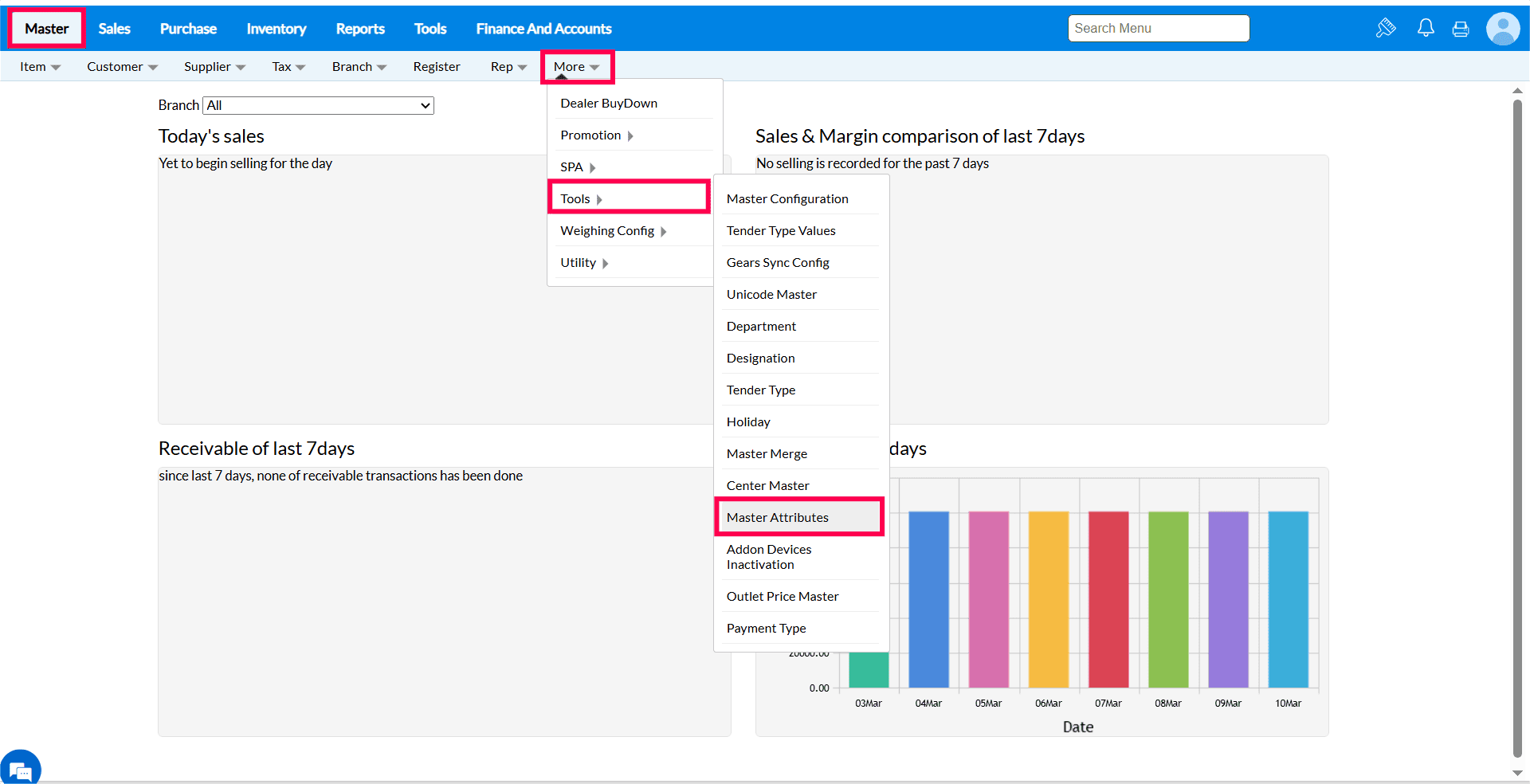 Answer: The Master Attribute feature may not be enabled for your domain. Please contact truepos-support@gofrugal.com to request activation.