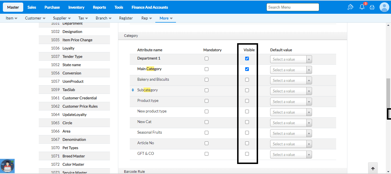 TruePOS provides certain default fields essential for the retail industry. Additionally, TruePOS offers extra fields beneficial for different verticals and businesses. Based on your business requirements, you can determine which fields should be present in the Masters and which are unnecessary. This control is available in the Master Configuration menu.
