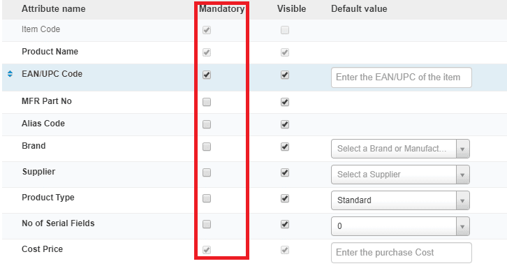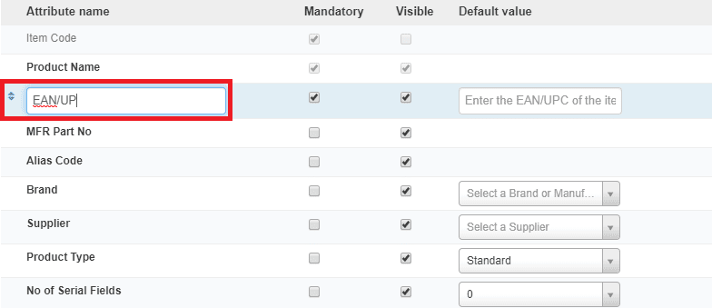 To enable an attribute or field from the Item Master screen, mark the checkbox under the Visible column.