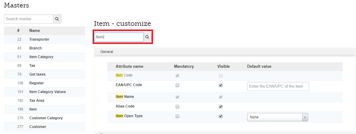 Using the Master Configuration screen, you can show or hide fields that appear in the Master menu screens, such as Item, Customer, Supplier, and Branch, according to your business needs.