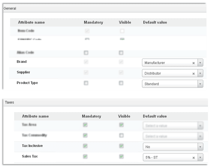 To hide an attribute from the Item Master screen, clear the selected checkbox under the Visible column.