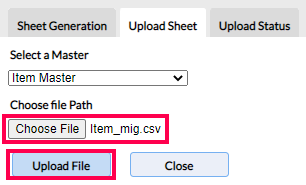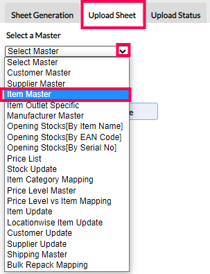 Step 10: In the Upload Sheet section, Select a Master > Item Master (from the drop-down).