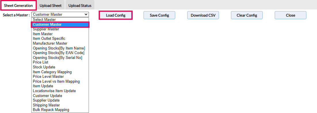 Step 2: In the Sheet Generation section, from the drop-down of Select a Master field, choose Customer Master. And click on Load Config.