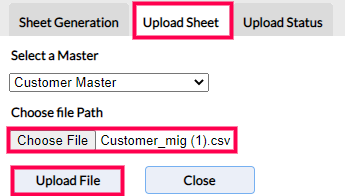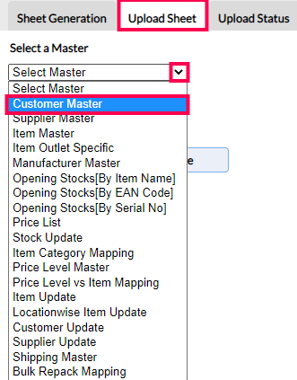 Step 7: In the Upload Sheet section, from the drop-down of Select a Master field, choose Customer Master.