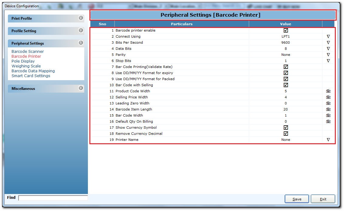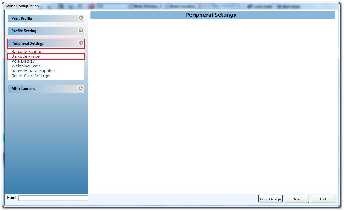 Peripheral Settings The peripheral settings refers to peripheral device settings. These are those devices that are connected to a product to add functionalities. The peripheral device in POS can be Barcode Scanner, Barcode Printer, Pole Display, ...