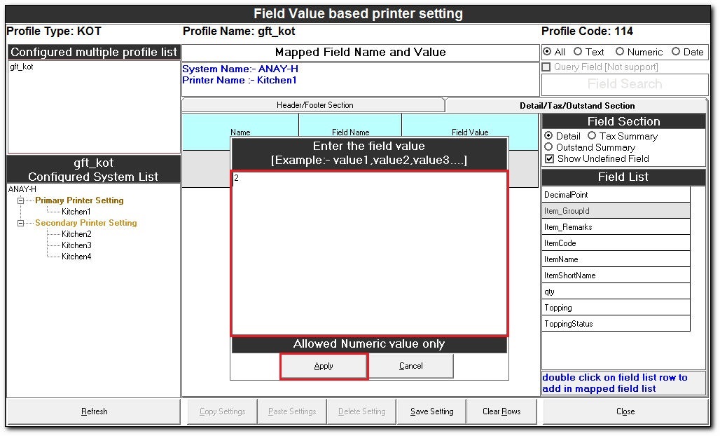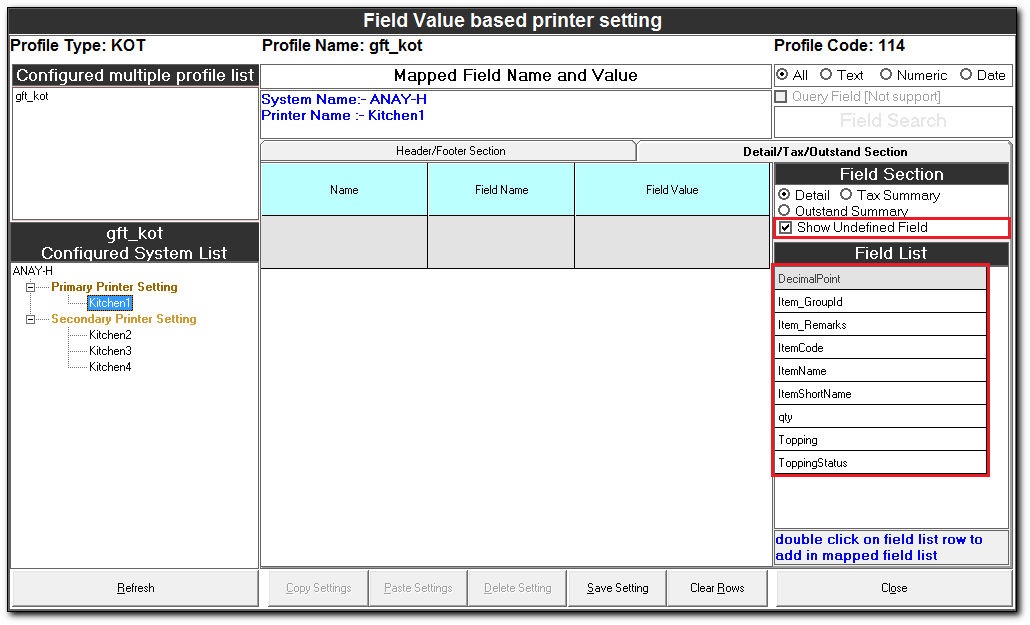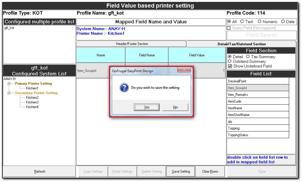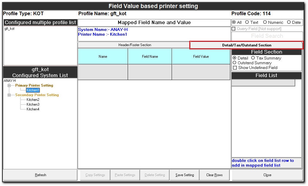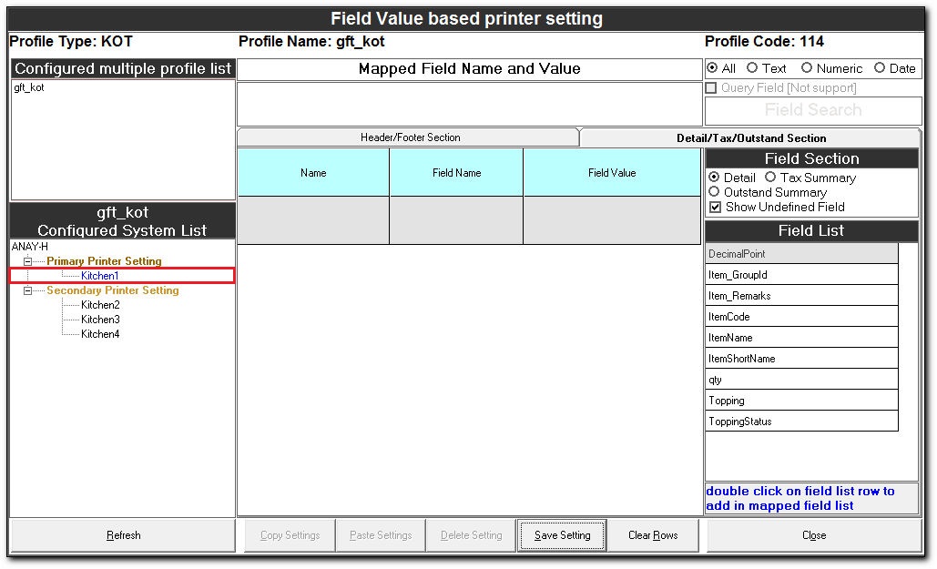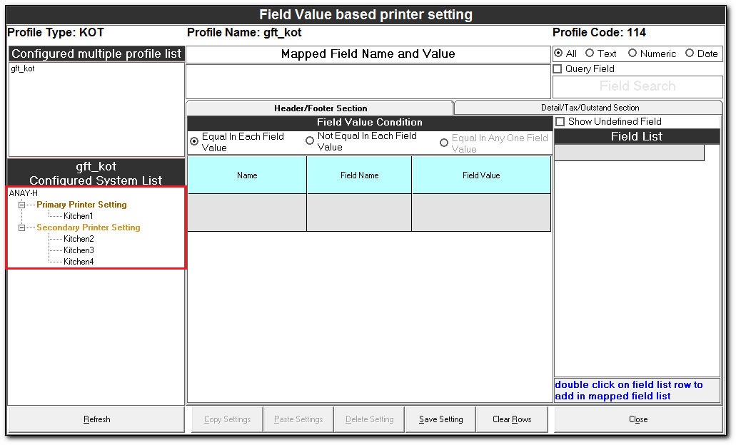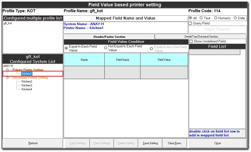 Field Value based printer setting The Field Value based printer setting is used to route the documents to the respective printers in a kitchen based on the field values. Steps for Field Value based printer setting In the Easy Print Designer screen, ...
